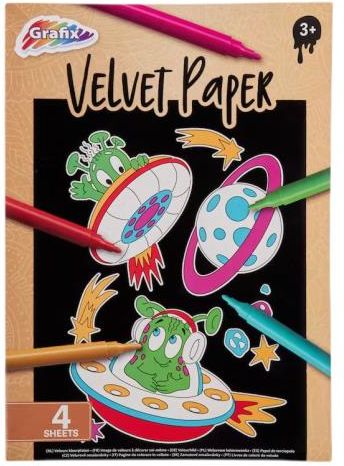 Aksamitna kolorowanka 4 obrazki Kosmos 3+ Grafix Wesołe kolorowanki zapewnią dzieciom wiele godzin wspaniałej zabawy. Twórz najpiękniejsze obrazki za pomocą tych aksamitnych obrazków do kolorowania. Wybierz ulubiony obrazek, weź kredki lub mazaki i daj się pokierować fantazją! Mnóstwo radości dla każdego! Tło obrazka wykonane jest z aksamitnego czarnego weluru. zestaw z 4 różnymi obrazkami Specyfikacja: Wymiary obrazka: 29,5 x 21,5 cm
