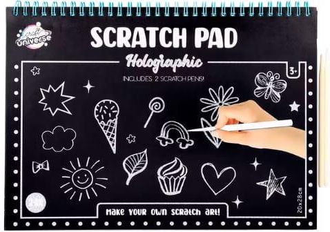 Magiczny blok zdrapka 24 arkusze A4 Holograficzny Wyczaruj najpiękniejsze dzieła zdrapując czarną powierzchnię za pomocą specjalnego długopisu. Magiczny blok zawiera 24 arkusze oraz 2 specjalne długopisy do zdrapywania. Specyfikacja: Razem z 2 długopisami do zdrapywania Format A4