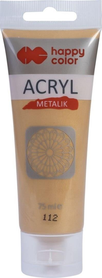 Farba akrylowa 75ml zloty 0075-112 HAPPY COLOR Wysokiej jakości farba akrylowa o kolorze metalicznym idealna dla kazdego artysty. Przeznaczona do malowania na drewnie, papierze, szkle, matalu oraz tkaninach. Mozna mieszac ją z wodą lub innymi kolorami z tej serii Bezzapachowa Wodoodporna po wyschnieciu Pedzle i zabrudzone powierzchnie latwo zmywalne mydlem oraz z wodą Dla dzieci powyzej 3 lat Posiada atest CE oraz certyfikat EN 71-3 Pojemnośc: 75 ml 5902979001185