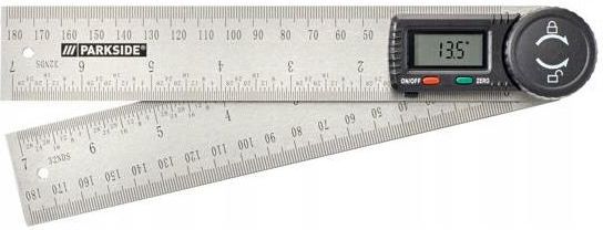 Kątomierz cyfrowy Parkside Wygodne wyświetlanie zmierzonych wartości na wyświetlaczu LCD; Funkcja automatycznego włączania i wyłączania; Możliwość ręcznego włączania i wyłączania Do dokładnego pomiaru kątów w stopniach; Ustawienie punktu zerowego w każdej pozycji; Z przyciskiem blokującym do prostego przenoszenia; Ramię ze zintegrowaną skalą (180 mm / 7”) Wygodne wskazanie wartości mierzonej na wyświetlaczu; Funkcja auto-on i auto-off; Możliwość ręcznego włączania i wyłączania. Materiał wykonania: stal szlachetna, ABS Parametry techniczne: Zakres pomiarowy: 0-360° Rozdzielczość: 0,1° Auto-on: podczas ustawiania kąta Auto-off: po ok. 5 min