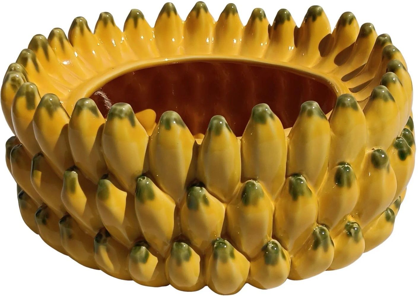 Osłonka Banan żółta - 32,5 cm Ta radosna, szeroka osłonka w formie misy przyciąga wzrok swoim wyjątkowym, trójwymiarowym wzorem przypominającym ułożone kaskadowo banany z drobnymi, zielonymi detalami. To niezwykle optymistyczny i zabawny dodatek, który z pewnością ożywi każdą przestrzeń i świetnie wyeksponuje niższe lub pnące rośliny.