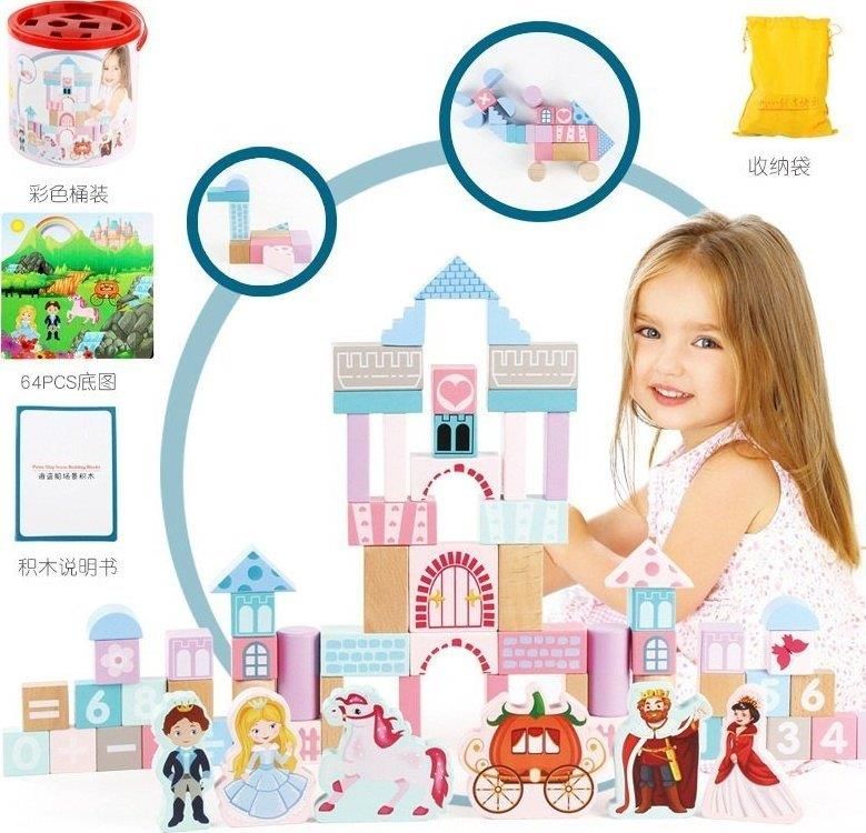 Zestaw drewnianych klocków dla dziewczynek "Księżniczka w zamku" Zestaw malowanych drewnianych, bezpiecznych klocków z motywem księżniczki i zamku dla dzieci już od 3-go roku życia. Zestaw składa się z 67 elementów- klocków, w zestawie znajdują się też puzzle. Doskonała nauka kształtów, figur geometrycznych, oraz zabawa pobudzająca wyobraźnię i logiczne myślenie. Klocki zapakowane są w wiaderko, sorter na górze którego znajdują się otwory o różnych kształtach, do których należy dopasować odpowiednie klocki. Zawartość zestawu:Szczegóły: Zabawka odpowiednia dla dzieci od 36-go miesiąca życia. worek na klocki ok. 30 cm x 34 cm, opakowanie ok. 21,5 cm x 22,5 cm. klocki, puzzle, wiaderko na klocki, worek na klocki ze sznureczkiem, instrukcja.
