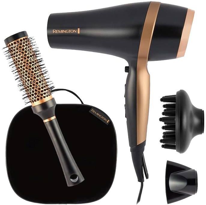 Suszarka do włosów ze szczotką Remington D6960GP Mocna suszarka o mocy 2100 W do szybkiego suszenia i stylizacji 3 ustawienia ciepła / 2 prędkości + zimny nadmuch Ceramiczna kratka jonowa W zestawie wszechstronna, okrągła szczotka do stylizacji włosów Cechy i funkcje Profesjonalna stylizacja we …