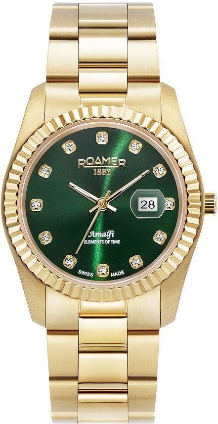 Piękny model dla kobiety. Wspaniała zielona tarcza dobrze komponuje się ze złotym kolorem koperty i bransolety.