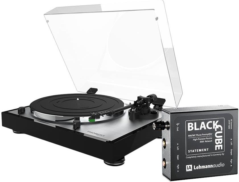 Zestaw składający się z gramofonu Thorens TD 402 DD oraz przedwzmacniacza gramofonowego Lehmannaudio Black Cube Statement.