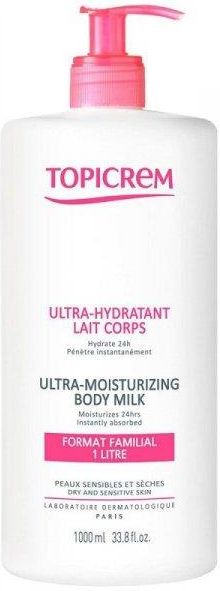Topicrem Ultra nawilżający balsam do ciała 1000ml Data ważności 01.2026r Nawilża, odżywia i chroni skórę. Odpowiedni dla całej rodziny, zapewnia miękką, elastyczną i nawilżoną skórę przez 48 godzin. Jego kremowa, nietłusta i nieklejąca konsystencja mleczka natychmiast wnika w skórę. W połączeniu z zapachem z nutami lilii wodnej, konwalii i cedru zapewnia maksymalny komfort aplikacji. Nawilżający krem ​​do ciała pozostawia skórę gładką (95%) i pozwala szybko się ubrać po użyciu 48 godzin po aplikacji skóra jest nadal nawilżona na poziomie Aby uzyskać optymalne rezultaty, nałóż to nawilżające mleczko na skórę, wykonując lekki masaż raz lub dwa razy dziennie. Jego ultrapraktyczny format butelki z pompką pozwala uzyskać odpowiednią dawkę i jest łatwy w użyciu. Testowane pod kontrolą dermatologiczną i pediatryczną, to mleczko jest odpowiednie dla wrażliwej, suchej i odwodnionej skóry niemowląt, dzieci i dorosłych. Wyprodukowany we Francji, nie zawiera parabenów, składników pochodzenia zwierzęcego, olejków eterycznych ani alkoholu. Jego kremowa konsystencja i delikatny kwiatowy zapach sprawiają, że jest to bardzo komfortowy produkt, źródło dobrego samopoczucia, które przyjemnie się aplikuje na co dzień. GŁÓWNE SKŁADNIKI: Ultranawilżający balsam do ciała Topicrem zawiera 10% gliceryny o czystości 99,5%, która nawilża skórę, oraz 2% DHA (dihydroksyaceton), składnik nawilżający o czystości 98,5%. Zawiera również 1,5% wosku pszczelego oczyszczonego na węglu aktywnym, który odżywia i chroni skórę.