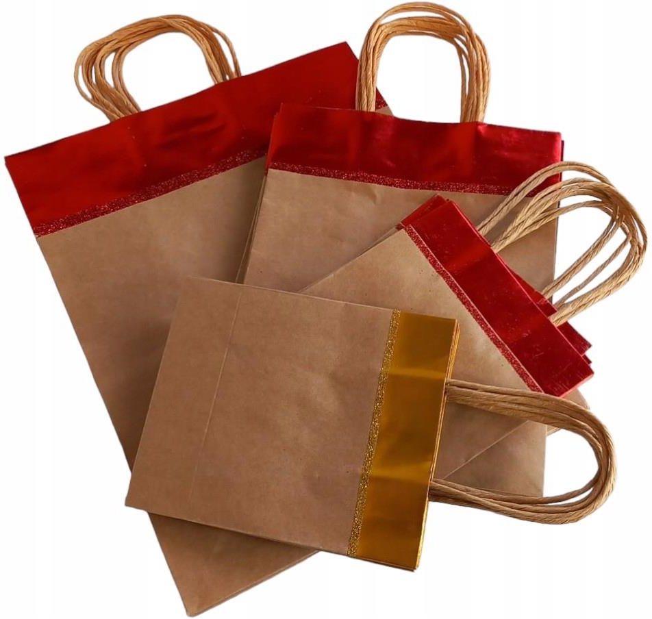 Torba Torebka papierowa 3 rozmiary Zestaw 18szt Produkt fabrycznie nowy, nieużywany w oryginalnym opakowaniu. Zestaw 18 sztuk. Torebki na prezenty z papieru typu kraft zawierają 8 małych, 5 średnich i 5 dużych torebek. Każdy rozmiar torebek zawiera złotą lub czerwoną folię. Są dostępne w 3 różnych wymiarach: S: 16,67 cm ( z uchwytem 25,5 cm) x 13,97 cm x 7,54 cm; M: 24,77 cm ( z uchwytem 34 cm) x 19,69 cm x 12,07 cm; L: 33,02 cm ( z uchwytem 41 cm) x 26,59 cm x 14,61 cm. Są one wykonane z wysokiej jakości mocnego papieru. Marka: JOYIN Wymiary opakowania: ? 42,29 x 29,8 x 6,6 cm; 630 g Ilość w opakowaniu: 18 sztuk kod towaru 13463