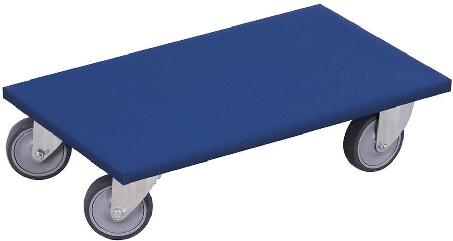 Joker meblowy, koła obrotowe z gumy termoplastycznej Wymiary zew.: 600 x 350 x 145 mm (szer./gł./wys.) Powierzchnia użytkowa: 600 x 350 (szer./gł.) Wykonanie: z matą antypoślizgową, niebieską płyta sklejka 18 mm Koła: koła z gumy szarej termoplastycznej, felga z tworzywa, precyzyjne łożysko kulkowe, bezśladowe, O 100 mm, 4 koła obrotowe, każde z kół przykręcone 4 śrubami do płyty Nośność: 300 kg