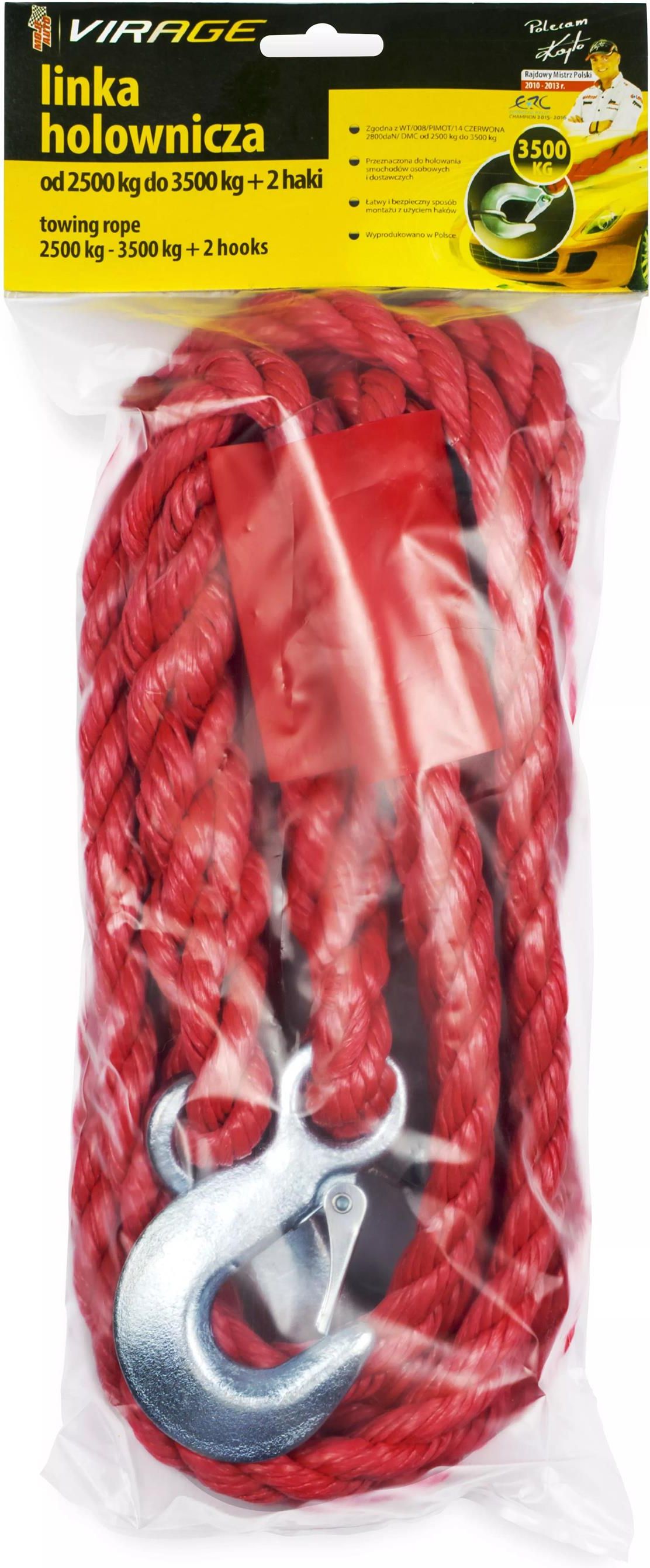 Linka przeznaczona jest do holowania pojazdów o masie od 2500 kg do 3500 kg. WŁAŚCIWOŚCI PRODUKTU Zgodna z WT/008/PIMOT/14 CZERWONA 2800daN/ DMC od 2500 kg do 3500 kg. Przeznaczona do holowania smochodów osobowych i dostawczych. Łatwy i bezpieczny sposób montażu z użyciem haków. Wyprodukowano w Polsce. SPOSÓB UŻYCIA Długość minimalna holu wynosi 4 m. Linkę należy mocować wyłącznie do fabrycznych zaczepów w samochodzie. W czasie holowania należy unikać nagłych szarpnięć, a także starać się, by linka była stale napięta, co nie pozwoli na jej najechanie przez holowany samochód i zerwanie. Linka nie służy do wyciągania samochodów z błota, zasp itp. Holowanie pojazdów powinno być zgodne z wymogami przestrzegania zasad ruchu drogowego w trakcie holowania pojazdu (Prawo O Ruchu Drogowym - Dział II, Rozdział 3, Oddział 9- Holowanie, Art. 31).