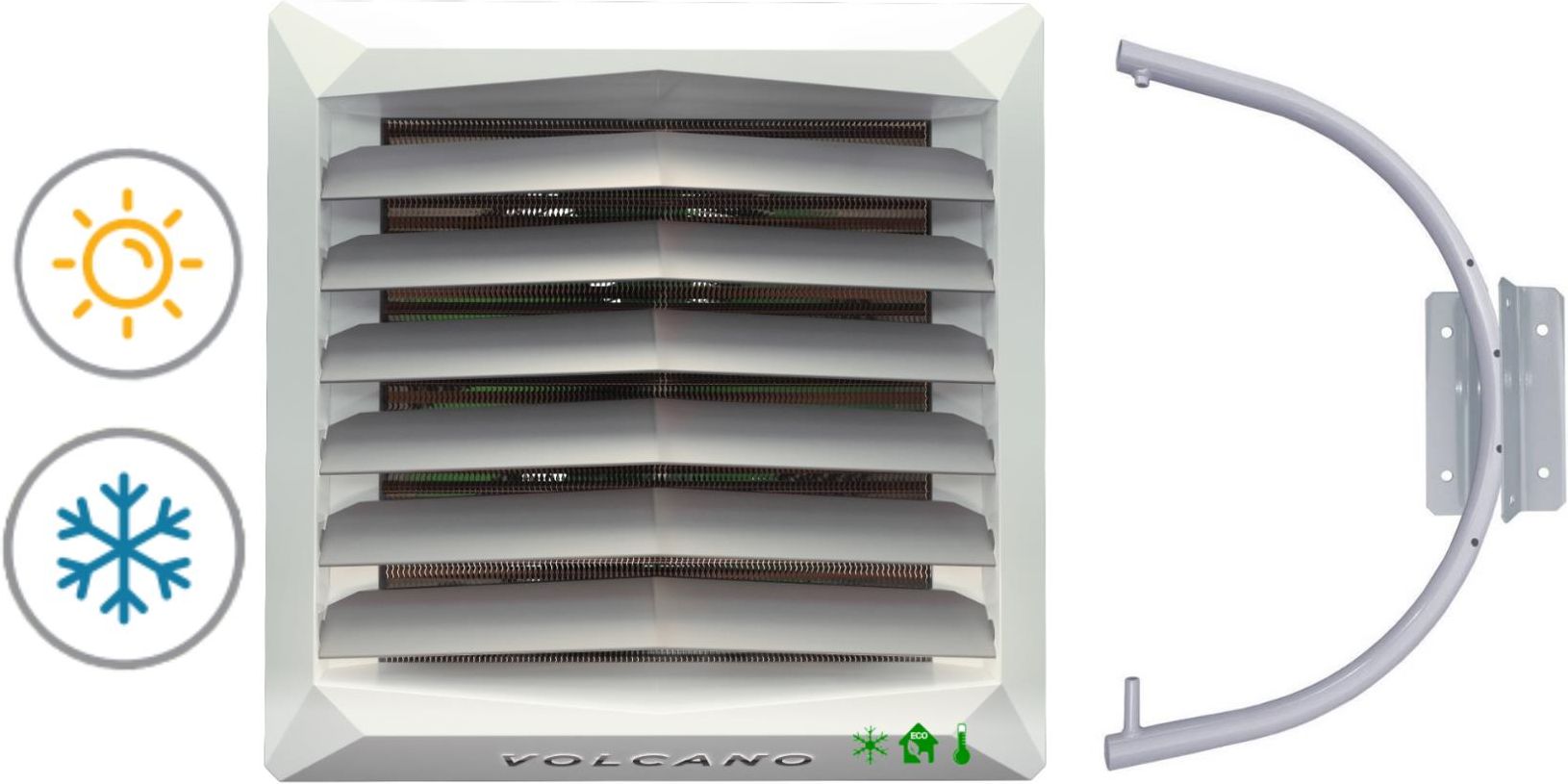 Nagrzewnica wodna VOLCANO VR MINI 3 AC 4-27kw Zestaw zawiera : - nagrzewnicę wodną VOLCANO z silnikiem AC - konsolę montażową - instrukcję obsługi Nagrzewnica zaprojektowana do pracy z pompą ciepła.