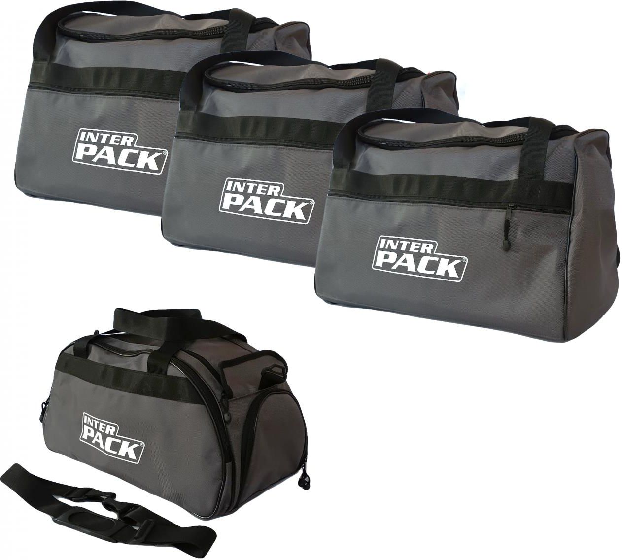 Zestaw 4 toreb do boksu Inter Pack. Zawiera trzy torby w rozmiarze L o pojemności 60 litrów oraz jedną torbę S o pojemności 28 litrów.