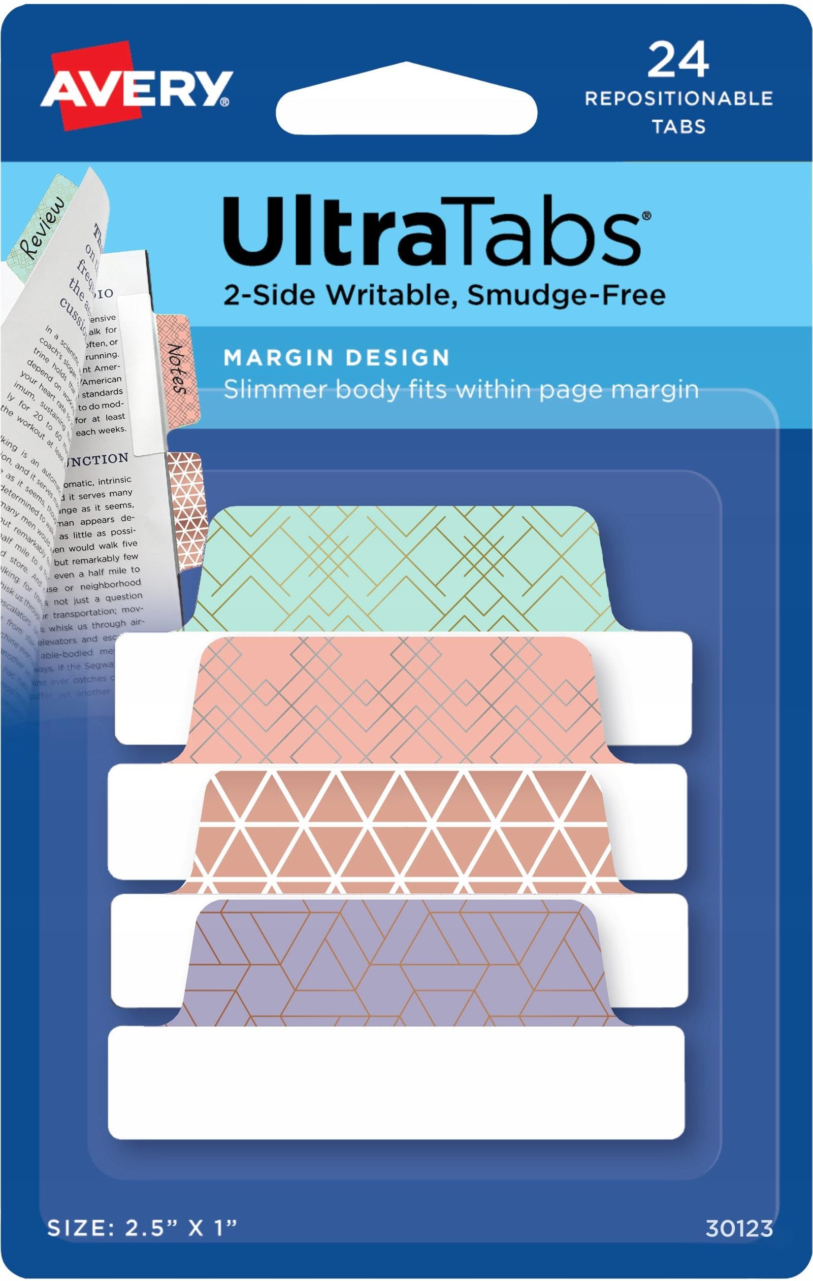 Ultra Tabs - samoprzylepne zakładki indeksujące Przezroczyste Ultra Tabs 30123 z kolorowymi zakładkami we wzorki, w formacie 63,5 x 25,4 mm. Niezawodnie przylegają, ale można je łatwo usunąć bez uszkadzania dokumentów lub zdzierania tuszu z papieru. Praktyczne, samoprzylepne zakładki indeksujące są idealne do oznaczania w notatkach, do katalogowania lub zaznaczania stron w książkach, dokumentach, planerach i pamiętnikach. Pomagają w organizacji w domu, szkole, na uczelni oraz w pracy. Samoprzylepne zakładki indeksujące Ultra Tabs składają się z przezroczystego korpusu, po którym można pisać oraz z zakładek we wzorki w kilku kolorach: miętowo-złotym, różowo-złotym, różowo-srebrnym oraz liliowo-miedzianym. Są idealne do oznaczania, można po nich pisać i nie rozmazuje się na nich większość długopisów, ołówków oraz markerów permanentnych. Solidne, do dwustronnego opisywania, usuwalne zakładki indeksujące UltraTabs w nowoczesnych wzorach Posiadają przezroczystą część, po której można pisać oraz kolorową, wzorzystą zakładkę Nie rozmazują się po użyciu większości długopisów, ołówków i markerów Pewnie przylegają, ale można je łatwo usunąć bez uszkadzania dokumentów Idealne do szybkiego indeksowania / oznaczania / organizowania 24 zakładki/opakowanie.