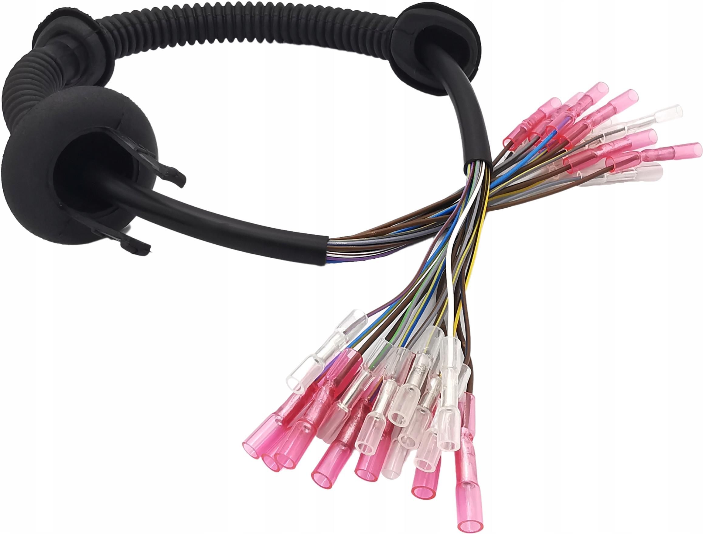 NOWY zestaw naprawczy wiązki przewodów klapy bagażnika: BMW 3 E46 SEDAN, COUPE, KABRIOLET1998r-2005r Wszystkie elementy zestawu są nowe: - 15 kablI FLRY-B – przewód samochodowy niskiego napięcia (FL) o zredukowanej grubości izolacji (R), z polwinitu (Y), z żyłą asymetryczną (B), prod. Polska, Niemcy, ok 70cm. (przekrój kabli od 0,35mm² do 0,75mm²) - osłona gumowa - zamiennik - zaciśnięte konektory rurkowe DSG CANUSA CRIMPSEAL II z koszulką termokurczliwą W sprzedaży posiadamy także zestaw z oryginalną osłoną.