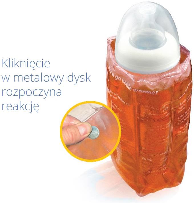 Innowacyjny podgrzewacz Cherub Baby Clik 'n Go nie potrzebuje baterii ani zasilania – wystarczy kliknąć w metalowy dysk, aby rozpocząć reakcję chemiczną, która w ciągu paru chwil podgrzeje znajdującą się wewnątrz butelkę lub słoik. Podgrzewacz można stosować również jako schładzacz - należy go w tym celu umieścić w lodówce i pozostawić na około 30 minut do wychłodzenia. Podgrzewacz można używać setki razy. Właściwości podgrzewa średniej wielkości butelkę w 10-15 minut, pozostaje ciepły przez około 1 godzinę, podgrzewa zawartość do około 38C , nie wymaga baterii czy zasilania, wielokrotnego użytku, może zostać użyty jako schładzacz, żelowy rękaw posiada wygodne napowe zapięcie, pasuje do większości butelek i słoiczków z jedzeniem dla dzieci, termoizolacyjny futerał w zestawie. Podgrzewacz: Podgrzewacz zbudowany jest z rękawa wypełnionego żelem, w którym zatopiony jest metalowy dysk – przełącznik, po jego kliknięciu rozpoczyna się reakcja chemiczna - płynny żel wewnątrz przybiera postać stałą oraz wydzielane jest ciepło. Podgrzewacz może być używany wielokrotnie i setki razy – po użyciu wystarczy podgrzać go w mikrofalówce lub wrzątku (‘naładować’) tak aby żel znów przybrał postać płynną. Schładzacz: Po umieszczeniu Click'n Go w lodówce, żel znajdujący się wewnątrz schładza się. Po wyjęciu z lodówki może zostać użyty do schłodzenia butelki lub słoiczka. Podgrzewacz: Umieść butelkę lub słoik wewnątrz podgrzewacza i zapnij go przy pomocy nap, Naciśnij metalowy dysk zatopiony w żelu aby rozpocząć reakcję chemiczną. Zacznie wydzielać się ciepło, które podgrzeje butelkę lub słoiczek, aby usprawnić proces możesz całość umieścić w termoizolacyjnym futerale Po około 10-20 minutach sprawdź czy pokarm osiągnął docelową temperaturę. Podgrzewacz pozostaje ciepły do około 1h. Dokładny czas podgrzewania zależy od ilości pokarmu oraz jego temperatury początkowej. Metody ładowania podgrzewacza: Metoda A (garnek): krok 1: zagotuj wodę w garnku krok 2: owiń podgrzewacz ręcznikiem lub szmatką aby uniknąć bezpośredniego kontaktu ze ściankami garnka krok 3: umieść tak zabezpieczony podgrzewacz w garnku z gotującą się wodą na około 10 minut - do momentu aż skrystalizowana zwartość stanie się znów w całości płynna Proces ładowania jest zakończony gdy w żelu nie pozostały żadne kryształy. Metoda B (mikrofalówka): Uwaga: podane czasy dopasowano do mikrofalówki o mocy około 1000W krok 1: wlej wodę do pojemnika do sterylizacji w mikrofalówce lub do torebki do sterylizacji Cherub Baby krok 2: umieść całość w mikrofalówce, upewniając się, że metalowy dysk podgrzewacza w całości zanurzony jest w wodzie i uruchom mikrofalówkę na 3 minuty krok 3: wyjmij podgrzewacz (uwaga, może być gorący!) i wstrząśnij nim aby rozpuścić pozostałe w żelu kryształy krok 4: umieść ponownie całość w mikrofalówce, upewniając się, że metalowy dysk podgrzewacza w całości zanurzony jest w wodzie i uruchom mikrofalówkę na 1,5 minuty krok 5: wyjmij podgrzewacz (uwaga, może być gorący!), jeśli w żelu wciąż znajdują się kryształy, umieść ponownie całość w mikrofalówce, upewniając się, że metalowy dysk podgrzewacza w całości zanurzony jest w wodzie i uruchom ją na 30 sekund krok 6: jeśli w żelu wciąż są kryształy - powtarzaj krok 5 aż do skutku, uwaga: w tym ostatnim etapie nie uruchamiaj mikrofalówki na dłużej niż 30 sekund. Proces ładowania jest zakończony gdy w żelu nie pozostaną żadne kryształy. Schładzacz: Umieść Click'n Go w lodówce na co najmniej 30 minut Po wyjęciu z lodówki, umieść butelkę lub słoiczek wewnątrz Click'n Go - powoli schłodzi on pożywienie, aby usprawnić proces możesz całość umieścić w termoizolacyjnym futerale