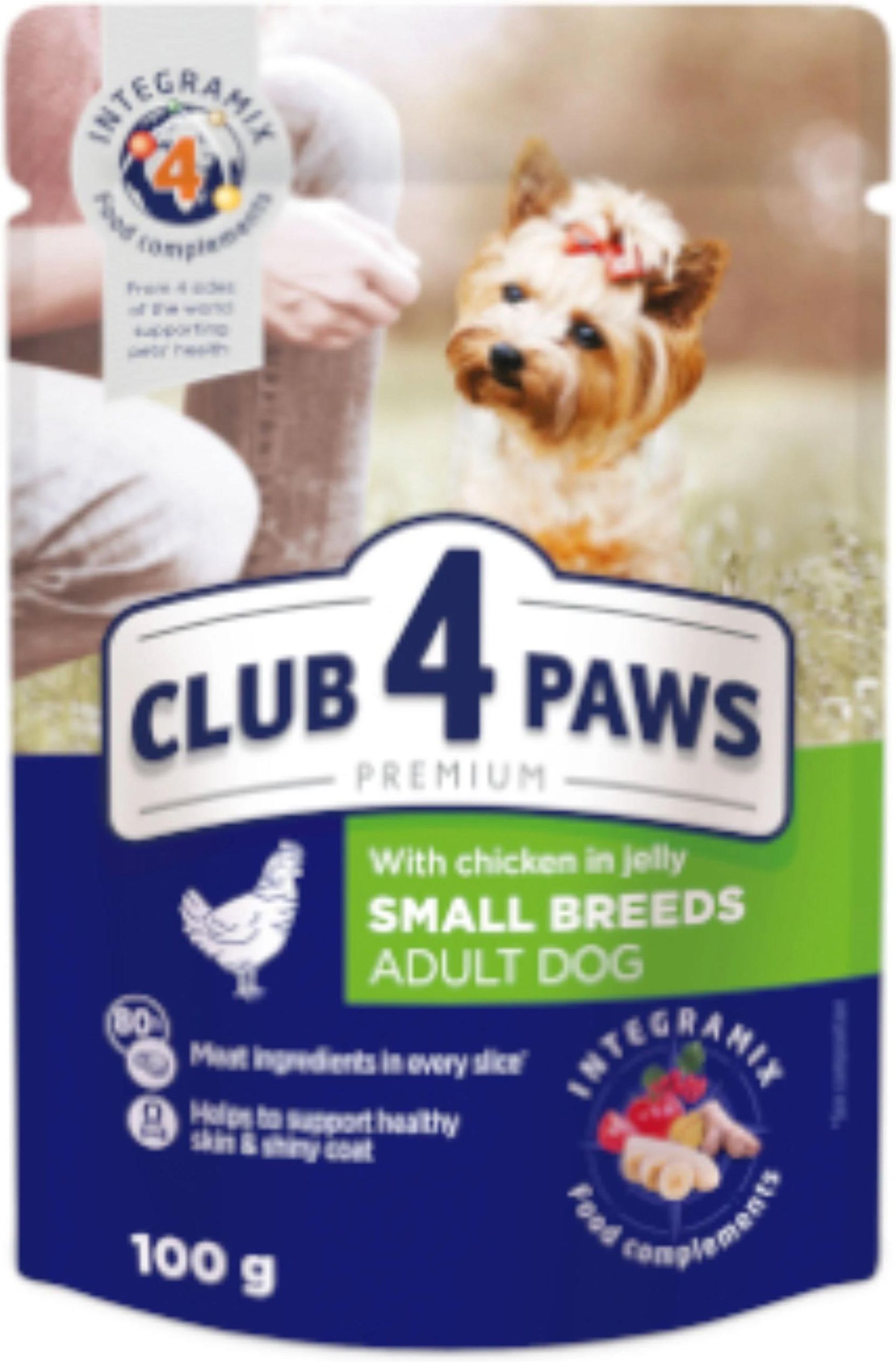 CLUB 4 PAWS Kurczak w galaretce saszetka dla dorosłych psów 100g Pełnoporcjowy i zbilansowany pokarm premium dla dorosłych psów małych ras. Do składu karmy wchodzą składniki mięsne nr 1; jest ona wzbogacona we wszystkie niezbędne witaminy i minerały, kompleks Omega 3 + Omega 6 i formułę INTEGRAMIX …
