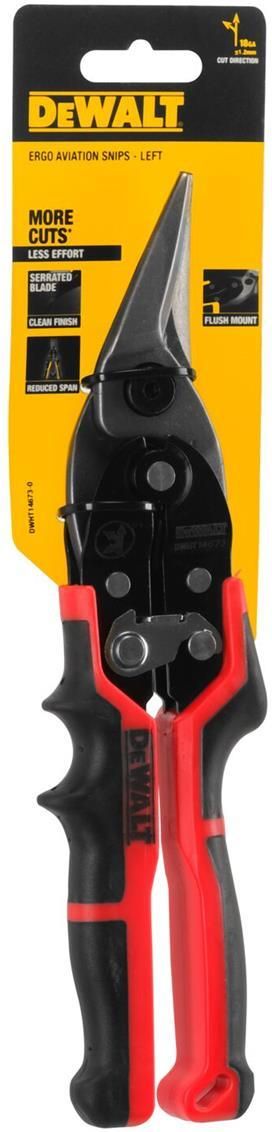 Nożyce dźwigniowe lewe do cięcia blachy DeWalt DWHT14673-0 nożyce dźwigniowe typu "Lotniczego" do cięcia blachy, do zastosowań w pracach blacharskich i dekarskich, dzięki specjalnej konstrukcji jest do 15% mniej wysiłku podczas cięcia, mają ząbkowane ostrze, które utrzymuje materiał w miejscu i zapewnia odpowiednie, czyste cięcie, posiadają amerykański certyfikat ergonomii, zastosowano w nich ulepszony projekt zewnętrznego zatrzasku, płaski profil umożliwia płynne cięcia. Parametry nożyc do blachy DeWalt DWHT14673-0 kierunek cięcia: do krótkich cięć prostych i cięć kształtowych o małym promieniu w lewo długość całkowita 255mm waga: 0,43kg kolor: czarno-czerwony