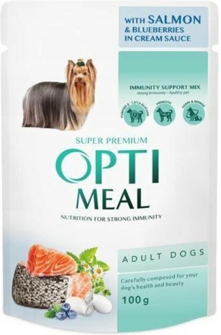 Optimeal Mokra Karma Dla Dorosłych Psów Łosoś z Borówkami w Sosie Kremowym 100 g Optimeal pełnowartościowa mokra karma dla dorosłych psów. Główne zalety produktu: Wysoka zawartość łososia dostarcza psom wysokiej jakości łatwo przyswajalne białko Niedenaturowany kolagen i kwasy tłuszczowe omega-3 z całych ryb wspierają zdrową skórę i lśniącą sierść Wysoka zawartość wody oczyszczonej dla zdrowia układu moczowego Jagody i zioła są naturalnym źródłem witamin i błonnika roślinnego Zawiera kompleks wzmacniający układ odpornościowy Immunity Support Mix, przydatne zioła, jagody i prebiotyki Omega-3 i 6, cynk, biotyna pomagają utrzymać zdrową skórę i lśniącą sierść Zawiera 83% białka pochodzenia zwierzęcego i rybnego Formuła SUPER PREMIUM. Dieta przygotowywana jest pod nadzorem lekarzy weterynarii z wykorzystaniem technologii szwajcarskiej firmy Swiss Pet Nutrition Group Unikalny kompleks wspomagający i wzmacniający odporność Immunity Support Mix składa się z: Specjalnie oczyszczone beta-glukany – poprawiają układ odpornościowy dla długiego życia zwierzęcia. Prebiotyk nowej generacji Actigen - reguluje równowagę korzystnej mikroflory jelitowej i zapewnia zdrowe trawienie. Zioła i jagody - dla lepszego trawienia i wsparcia odporności. OMEGA 3 i 6 / Cynk / Biotyna - zachowują zdrową skórę i piękną sierść.