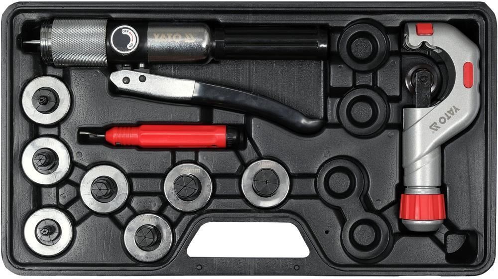 EKSPANDER HYDRAULICZNY DO RUR MIEDZIANYCH CALOWYCH YATO YT-21826 Zestaw ten jest niezwykle przydatny dla profesjonalistów w dziedzinie instalacji wodno-kanalizacyjnych, klimatyzacji, ogrzewania i innych branż wymagających łączenia rur miedzianych. Dzięki ekspanderowi hydraulicznemu można osiągnąć trwałe, szczelne i profesjonalne połączenia, co jest kluczowe dla niezawodnego funkcjonowania instalacji. Głowice: 3/8" (9.5 mm), 1/2" (12.7 mm), 5/8" (15.9 mm), 3/4" (19.0 mm), 7/8" (22.2 mm), 1" (25.4 mm), 1-1/8" (28.6 mm). W zestawie znajdują się trzy niezbędne narzędzia: Ekspander: główne narzędzie w zestawie, które umożliwia precyzyjne rozszerzanie końcówek rur miedzianych. Działa na zasadzie hydraulicznego nacisku, co pozwala na dokładne i równomierne rozszerzenie rury, zapewniając trwałe i szczelne połączenie. Obcinak: służy do precyzyjnego przycinania końcówek rur przed użyciem ekspandera. Zapewnia czyste i równomierne cięcie, co jest istotne dla jakości łączenia rur. Gratownik: jest używany do przygotowania końcówek rur przed rozszerzeniem. Pozwala usunąć ewentualne ostre krawędzie i zadziory, co zapewnia lepsze dopasowanie i trwałość połączenia. ZDJĘCIA PRODUKTU:
