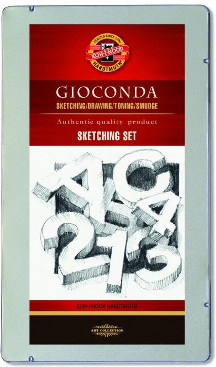 Zestaw mały w metalowej kasetce zawiera: ołówki grafitowe do szkicowania 1538/2B, 4B, 6B, pastel czarny w drewnie GIOCONDA NEGRO 8815/2, grafity w sztyfcie 4390 2B, 4B, 6B, gumkę chlebową 6423....