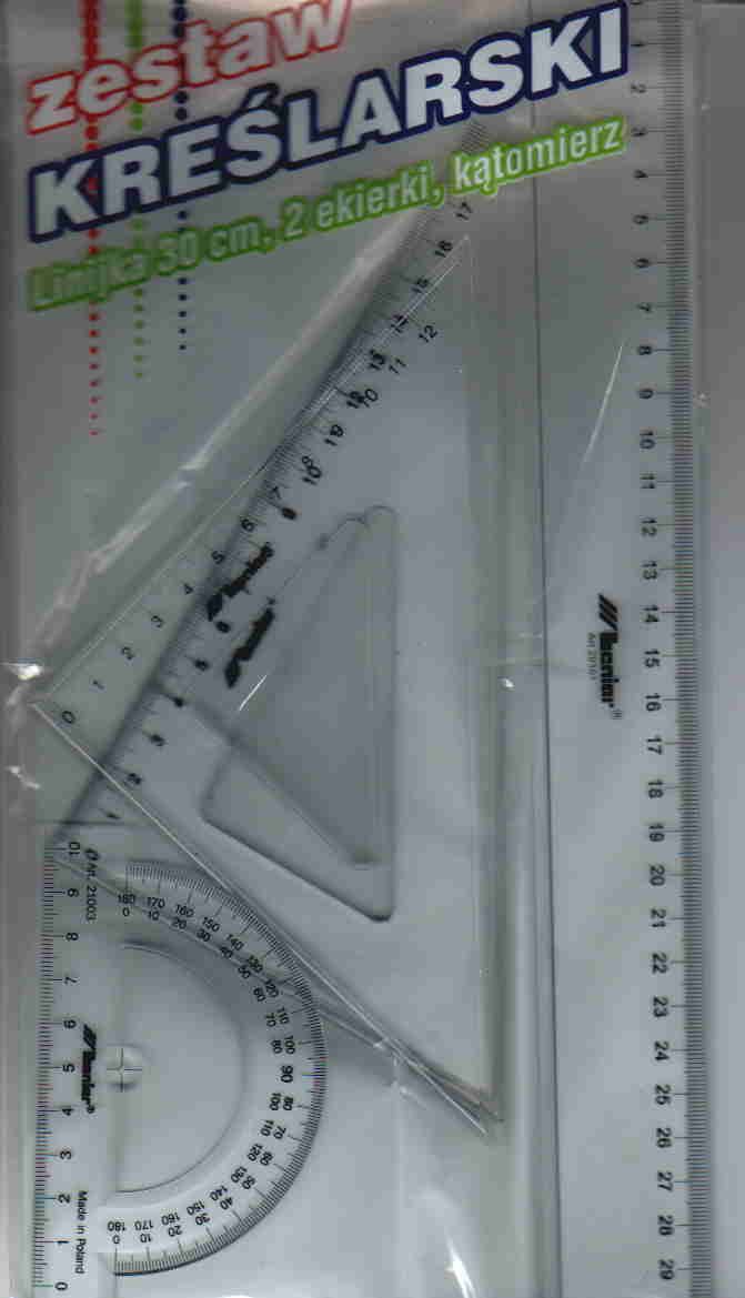 Zestaw kreślarski Szkolny pomoce geometryczne szkolne : linijka , 2 ekierki i kątomierz wykonany z przeźroczystego tworzywa podcięcie do kreślenia tuszem zestaw kreślarski zawiera 4 szt: ekierka 45o 19cm ( nr 10021) ekierka 45o 13cm (nr 10020) kątomierz 180o (nr 21003) linijka przeźroczysta 30cm ( …