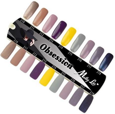 Wzornik MollyLac Obsession Połysk i Mat - 9 kolorów 210. Modest - Czekoladowy beż z delikatną srebrną drobinką, dzięki której uzyskasz niezwykły, wielowymiarowy manicure. Unikalny i niezwykle kobiecy kolor dla każdej fashionistki. 211 Light Terracota - Ciepły beż to jedna z wariacji na temat koloru "nude". Idealnie pasuje do każdego typu karnacji i sprawdzi się w każdej sytuacji. Doskonale sprawdzi się w brokatowych duetach! 212 Rich Lilac - Jeśli lubisz stonowane kolory, które obok bieli czerni i szarości będą równie interesujące z pewnością zakochasz się w tym przełamanym beżem liliowym kolorze. 213 Naughty Purple - Intensywny, głęboki śliwkowy odcień fioletu. Idealny kolor na wieczorne wyjście jak i na codzienne spotkania biznesowe. Pamiętaj, fiolet zawsze w modzie! 214 Honey Diva - Przełam jesienny manicure najmodniejszym kolorem słonecznej musztardy! Postaw na ten kolor, jeśli chcesz poprawić humor nie tylko sobie, ale także wszystkim dookoła! Niezwykle energetyczny i ciekawy kolor dla zdecydowanych kobiet! 215 Grey Stone - Nie bój się szarości! Szczególnie w takim zimnym odcieniu! Niezależnie od wybranej kreacji - pozwól mu działać! Zaufaj nam - kolor na pewno będzie wyglądać nieziemsko w każdej sytuacji 216 Yasmine Petal - Złamany szarością, cudowny odcień jasnego fioletu. Ciekawa, rozbielona barwa to zdecydowany atut tego koloru! Intymny, osnuty tajemnicą kolor idealny dla każdej romantyczki! 217 Miss Lilly - Biżuteryjny odcień fioletu idealny do podkreślenia osobowości i wydobycia piękna z każdej stylizacji. Łącz go z wszelkiego rodzaju fioletami aby uzyskać bardzo ciekawy efekt końcowy. 218 Deep Galaxy - Czarujący i niezwykle ciekawy kolor głębokiego granatu z niebieską drobiną przeniesie Cię w inną czasoprzestrzeń! Zaczaruj swój manicure tym kolorem i ciesz się niebanalną stylizacją.