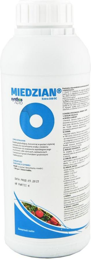 Miedzian Extra 350 SC 0,5l środek grzybobójczy i bakteriobójczy w sadach owocowych i warzywach Środek przeznaczony do stosowania przez użytkowników nieprofesjonalnych Rodzaj: środek grzybobójczy (fungicyd) Producent: Synthos Agro Substancja aktywna: miedź (w postaci tlenochlorku miedzi) – 350g Cu/l …