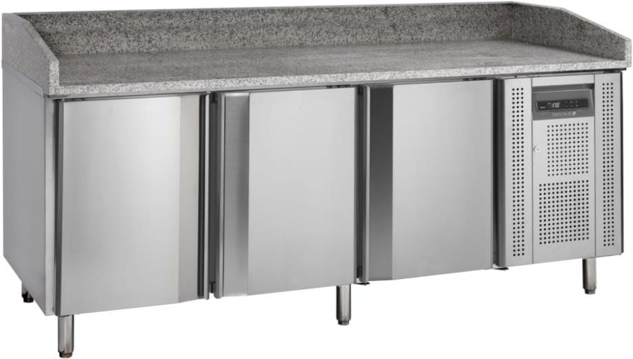 Nowy design Stal nierdzewna Prowadnice do 7 tac na pizzę przy każdych drzwiach (400x600 mm) Nadstawka VK38-200 na pojemniki GN 1/3 Blat granitowy Chłodzenie z funkcją wentylacji Automatyczne odszranianie Samozamykające się drzwi Seria stołów do pizzy PT wykonana jest ze stali nierdzewnej SS304. Granitowy blat idealnie nadaje się do wyrabiania pizzy, ponieważ pozostaje chłodny i zapobiega przywieraniu ciasta. Stoły dostępne są w szeregu rozmiarów w wersjach 2- i 3-drzwiowej. Można także dostosować je do swoich potrzeb instalując w nich szuflady. Do wyboru są modele z nadstawką na pojemniki GN lub bez niej. Nadstawki można też dodać w późniejszym terminie.