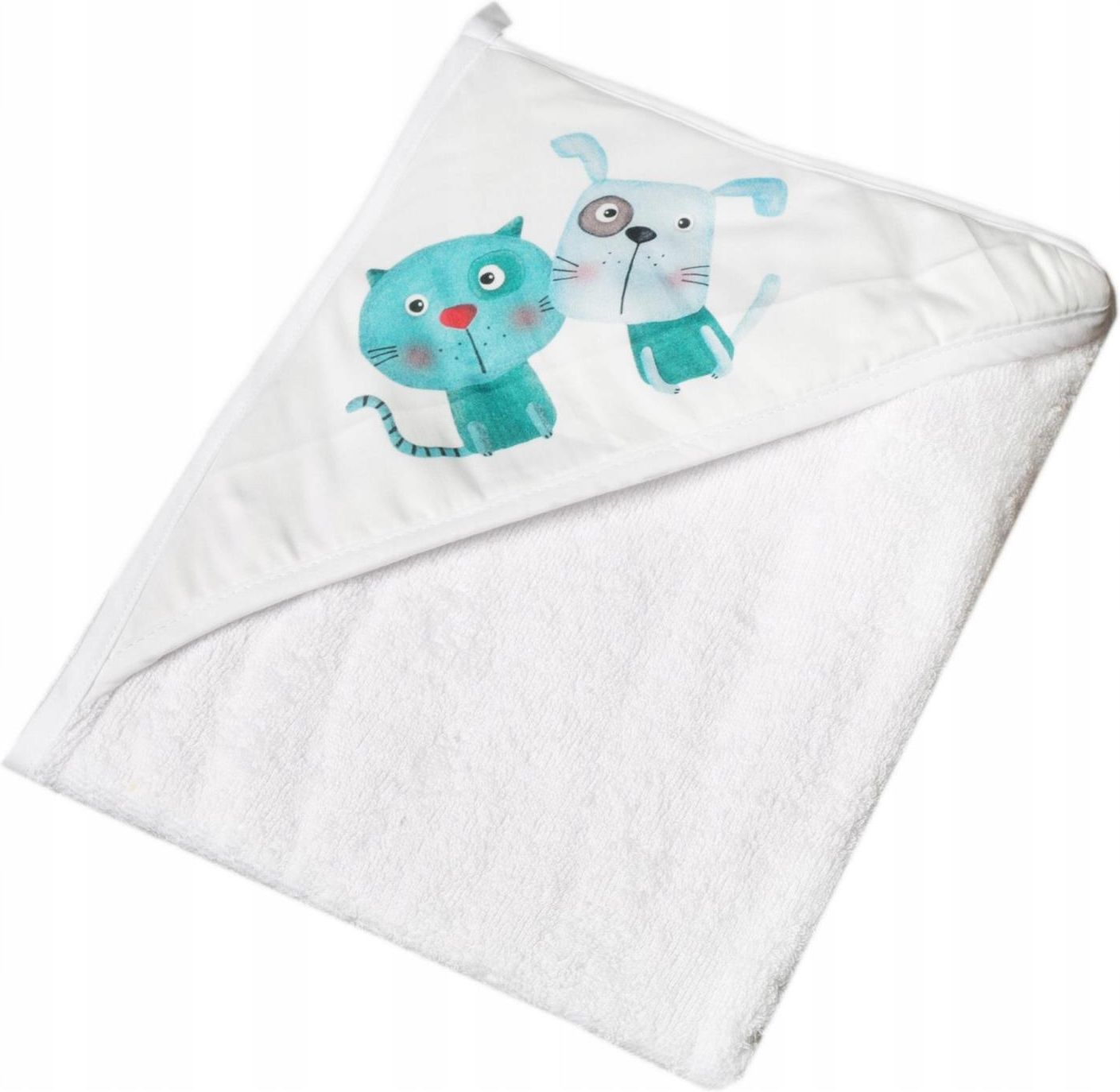 Miękkie okrycie kąpielowe z Kapturkiem PIES I KOT Materiał:100% bawełna Rozmiar: 80×80 cm Kolor: BIAŁY Z nowymi okryciami kąpiel to czysta radość. Dzieci i ich rodziców. Wykonane w 100% z bawełnianej tkaniny frotte, dzięki czemu są chłonne i szybko wysychają. Rodzice docenią również ich staranne, niepodrażniające skóry szycie. Okrycie kąpielowe: okrycia kąpielowe wykonane są z najlepszej jakości bawełny frotte bardzo miękkie i przyjemne w dotyku doskonale chłoną wilgoć po kąpieli trwałe w użytkowaniu, nie odbarwiają się łatwe w konserwacji, można prać automatycznie