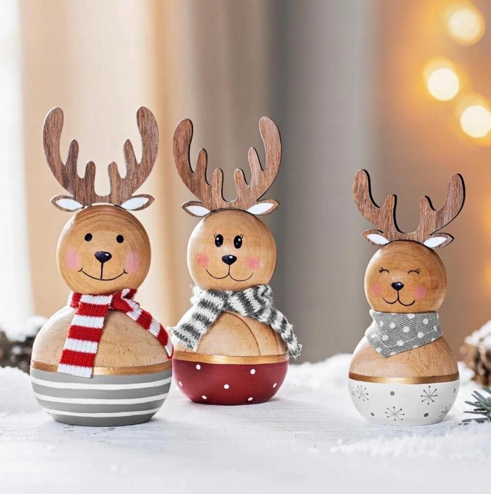 Drewniane figurki rodziny Waldi, zestaw 3 sztuki ozdoby dekoracja Wesoły drewniany renifer w trzech różnych rozmiarach wywoła uśmiech na każdej twarzy. Spójrzcie, jak wyglądają: córka z szalikiem w kropki i rodzice z szalikiem w paski. A kiedy je odwrócisz, ich małe, krzaczaste ogonki będą na ciebie patrzeć. Rodzina reniferów ładnie ozdobi stół w jadalni, parapet lub dowolną półkę. Śliczne drewniane figurki idealnie nadają się na drobny upominek.