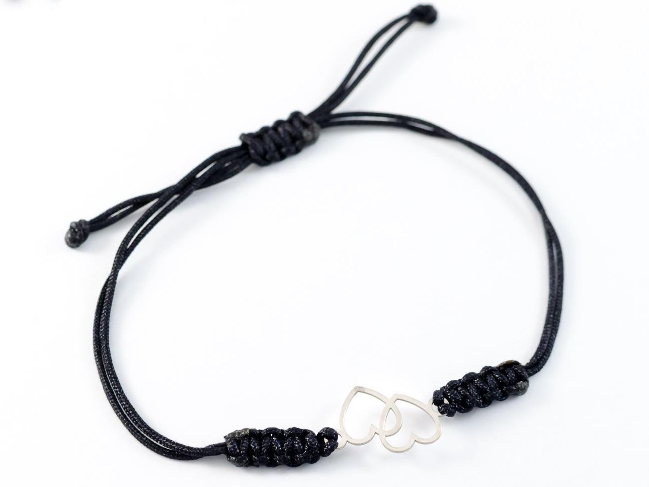 Bransoletka Damska Cordelle Dwa serca - Srebrna zawieszka (Próba 925) - Czarny Rzemyk - BSR-024 Brzostek