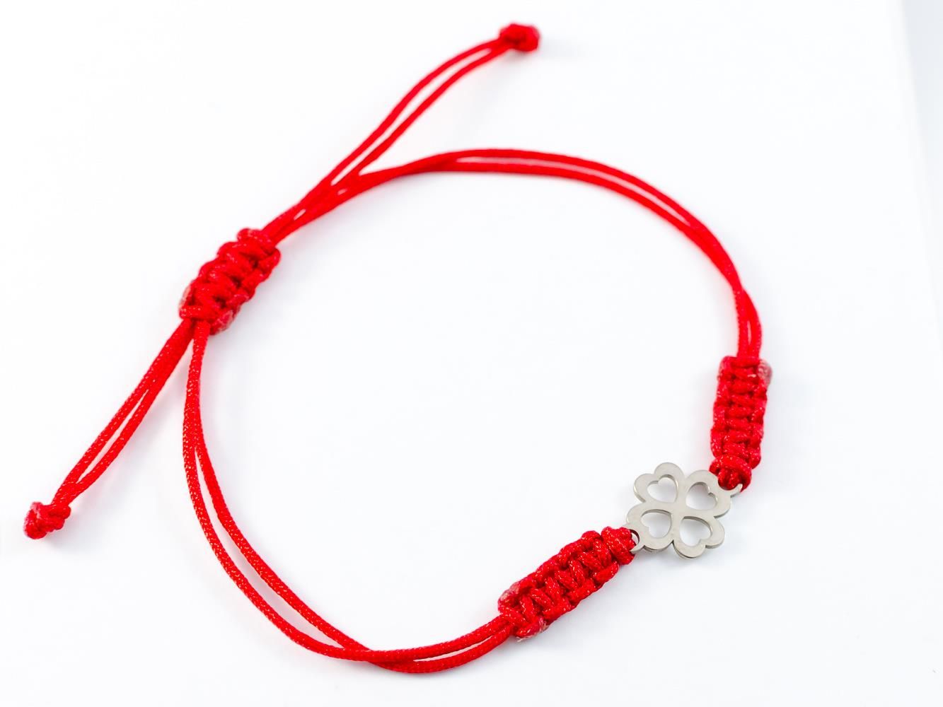 Bransoletka Damska Cordelle Koniczyna - Srebrna zawieszka (Próba 925) - Czerwony Rzemyk - BSR-008 Brzostek