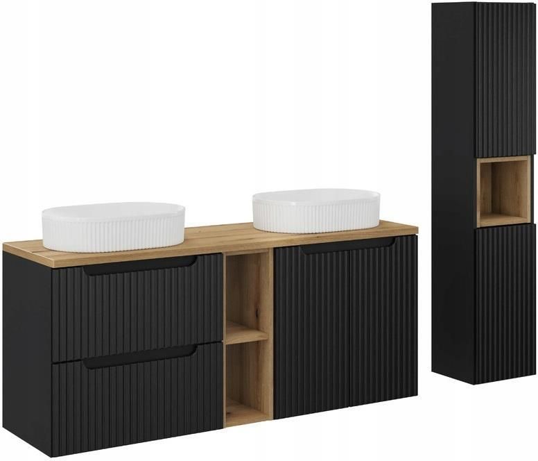 Zestaw NOVA w kolorze Czarny Mat W skład naszej kolekcji wchodzą meble, umożliwiające swobodne komponowanie i personalizację przestrzeni łazienkowej według indywidualnych potrzeb. Do kolekcji rekomendujemy różnorodne umywalki nablatowe i meblowe, lustra oraz inne akcesoria, które pozwolą Ci stworzyć kompleksową i stylową aranżację łazienki. Skład zestawu szafka 80cm szafka 20cm szafka 80cm blat 140cm umywalka BEYOND x2 szafka wysoka regał QUBIK Szafka 60cm Wykonanie korpus wykonany z płyty laminowanej w kolorze czarny mat front wykonany z płyty MDF - frezowane ryfle pionowe w kolorze czarny mat Wymiary szerokość: 60cm wysokość: 57cm głębokość: 39cm Szafka 20cm Wykonanie wykonanie z płyty laminowanej ergonomiczna głębokość szafek dolnych - 40cm Wymiary szerokość: 20cm wysokość: 57cm głębokość: 38cm Szafka 60cm Wykonanie korpus wykonany z płyty laminowanej w kolorze czarny mat front wykonany z płyty MDF - frezowane ryfle pionowe w kolorze czarny mat Wymiary szerokość: 60cm wysokość: 57cm głębokość: 39cm Blat 140cm Wymiary szerokość: 140,4cm wysokość: 2,5cm głębokość: 40cm Umywalka BEYOND Wymiary szerokość: 48cm wysokość: 11cm głębokość: 32,5cm Szafka wysoka Wykonanie korpus wykonany z płyty laminowanej w kolorze czarny mat front wykonany z płyty MDF - frezowane ryfle pionowe w kolorze czarny mat Wymiary szerokość: 30cm wysokość: 140cm głębokość: 25cm Regał QUBIK Wymiary szerokość: 26,7cm wysokość: 27,9cm głębokość: 21,3cm Właściwości aukcja dotyczy zestawu NOVA w kolorze czarny mat kolekcja NOVA składa się z dużej ilości elementów, w różnych kolorach, które dostępne są na naszych aukcjach (cena zależy od koloru) meble łazienkowe NOVA dostępne są w 4 wariantach kolorystycznych: czarny mat kaszmirowy mat dąb coast evoke biały mat meble w paczkach do samodzielnego montażu do mebla dołączona instrukcja oraz wszystkie akcesoria transport na terenie całej polski GRATIS - polski producent Ze względu na gabaryty paczek i normy dźwigania w pracy kierowca nie ma obowiązku wnoszenia mebli bezpośrednio do domu.