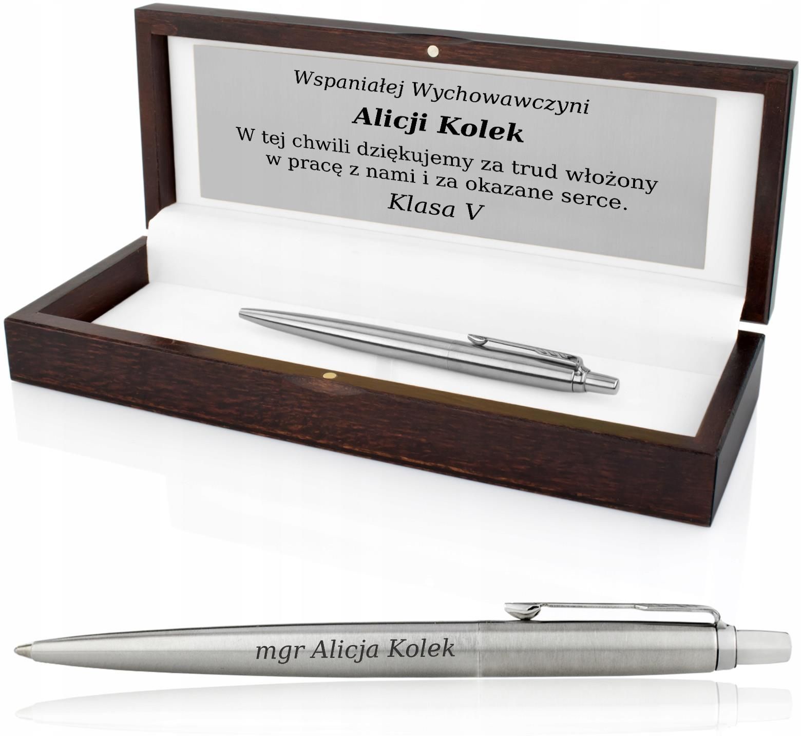 Długopis Parker Jotter umieszczony w ekskluzywnym drewnianym etui, stanowi doskonały pomysł na oryginalny prezent. Solidny i niezawodny długopis, wykonany z najwyższej jakości stali nierdzewnej z chromowanymi wykończeniami. Twoja indywidualna dedykacja zamieszczona na prezencie sprawi, że stanie się on miłą pamiątką na długie lata. Grawer wykonujemy na korpusie długopisu, oraz na tabliczce wewnątrz pudełka. Parametry Długopis wykonany ze stali nierdzewnej (szczotkowanej) z chromowanymi wykończeniami charakterystyczna strzała w klipsie doskonale oddaje jego charakter sprężynowy mechanizm wysuwania wkładu kolor wkładu: niebieski grawer dedykacji Etui wymiary: 17,5 x 6,5 x 3 cm kolor: czarny materiał zewnętrzny: ekoskóra solidnie wykonane ze sztywnego, grubego papieru miękkie, eleganckie wypełnienie w kolorze ecru wygodne i funkcjonalne zamykanie na zatrzask dedykacja na tabliczce wewnątrz Personalizacja Aby w pełni spersonalizować swój prezent, skorzystaj z edytora. Wprowadź tylko odpowiednie dane, a nasi graficy zajmą się resztą.