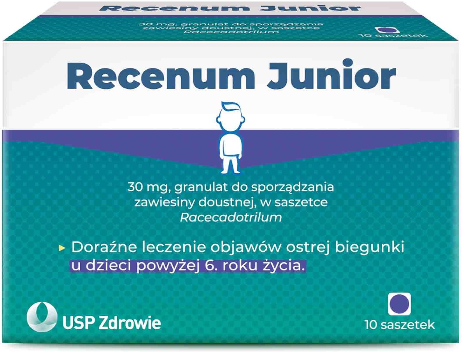 Recenum Junior to produkt leczniczy w postaci granulatu do sporządzania zawiesiny doustnej. Produkt wskazany do uzupełniającego leczenia objawowej, ostrej biegunki u dzieci powyżej 6. roku życia. Skład: Substancją czynną leku jest racekadotryl (Racecadotrilum). Każda saszetka zawiera 30 mg racekadotrylu (Racecadotrilum). Pozostałe składniki to: sacharoza; krzemionka koloidalna bezwodna, powidon (K30). Wskazania i działanie: Recenum Junior to lek wskazany do stosowania w celu uzupełniającego leczenia objawowej, ostrej biegunki u dzieci powyżej 6. roku życia, z jednoczesnym stosowaniem nawodnienia doustnego i zwykłego postępowania podtrzymującego, jeśli samo takie leczenie nie pozwala na opanowanie objawów klinicznych, a leczenie przyczynowe nie jest możliwe. Recenum Junior zawiera racekadotryl, który zmniejsza wydzielanie wody i elektrolitów do światła jelita i zmniejsza ilość stolców biegunkowych, przez co zmniejsza utratę wody i zmniejsza konieczność nawodnienia. Dawkowanie: Dawka zalecana uzależniona jest od masy ciała dziecka: 1,5 mg/kg na dawkę (co odpowiada 1-2 saszetkom), 3 razy na dobę w regularnych odstępach. U dzieci o masie ciała od 13 do 27 kg: jedna saszetka na dawkę. Dawkę należy stosować 3 razy na dobę, czyli dawka dobowa to 3 saszetki (3 razy dziennie po 1 saszetce). U dzieci o masie ciała od 27 do 40 kg: dwie saszetki na dawkę. Dawkę należy stosować 3 razy na dobę, czyli dawka dobowa to 6 saszetek (3 razy dziennie po 2 saszetki). U dzieci o masie ciała poniżej 13 kg lekarz może zalecić stosowanie leku Recenum Baby 10 mg, granulat do sporządzania zawiesiny doustnej, w saszetce. Przeciwwskazania: Kiedy nie stosować: jeśli dziecko ma uczulenie na racekadotryl lub którykolwiek z pozostałych składników leku Recenum Junior. Jeśli u dziecka występuje nietolerancja niektórych cukrów należy skonsultować się z lekarzem przed podaniem dziecku leku Recenum Junior. Interakcje: Należy powiedzieć lekarzowi lub farmaceucie o wszystkich lekach przyjmowanych przez pacjenta obecnie, lub ostatnio, a także o lekach, które pacjent planuje przyjmować. Działania niepożądane: Jak każdy lek, lek ten może powodować działania niepożądane, chociaż nie u każdego one wystąpią. Należy przerwać podawanie dziecku leku Recenum Junior i natychmiast skontaktować się z lekarzem, jeśli wystąpią objawy obrzęku naczynioruchowego, takie jak: obrzęk twarzy, języka lub gardła; trudności w przełykaniu; pokrzywka i trudności w oddychaniu. Niezbyt częste (występują rzadziej niż u 1 pacjenta na 100): zapalenie migdałków, wysypka i rumień (zaczerwienienie skóry). Częstość nieznana:rumień wielopostaciowy (różowe zmiany na skórze kończyn i wewnątrz jamy ustnej), obrzęk języka, obrzęk twarzy, obrzęk ust, obrzęk powiek, pokrzywka, rumień guzowaty (podskórne stany zapalne w postaci guzków), wysypka grudkowa (wykwity na skórze z małymi, twardymi i guzkowatymi zmianami), świerzbiączka (swędzące zmiany skórne), świąd (uogólnione swędzenie). Ostrzeżenia i środki ostrożności: Przed rozpoczęciem przyjmowania leku Recenum Junior należy zwrócić się do lekarza lub farmaceuty jeśli: dziecko ma mniej niż 6 lat; występuje krew lub ropa w stolcu i dziecko ma gorączkę. Przyczyną może być zakażenie bakteryjne, które powinno być leczone przez lekarza; u dziecka występuje biegunka przewlekła lub biegunka spowodowana przyjmowaniem antybiotyków; u dziecka występują zaburzenia czynności nerek lub wątroby; u dziecka występują przedłużające się lub niekontrolowane wymioty; dziecko ma cukrzycę (patrz „Recenum Junior zawiera sacharozę”); biegunka u dziecka ma bardzo dużą objętość, utrzymują się wymioty, pojawiają się oznaki; odwodnienia (bladość powłok, suchość błon śluzowych, ospałość) lub brak apetytu – w takich sytuacjach konieczny może być dożylny sposób nawadniania i dziecko może wymagać leczenia szpitalnego. Zgłaszano występowanie reakcji skórnych w trakcie stosowania leku. W większości przypadków były to łagodne reakcje. Jeśli wystąpią ciężkie reakcje skórne, leczenie należy natychmiast przerwać. Producent: USP Zdrowie Sp. z o.o. ul. Poleczki 35, 02-822 Warszawa