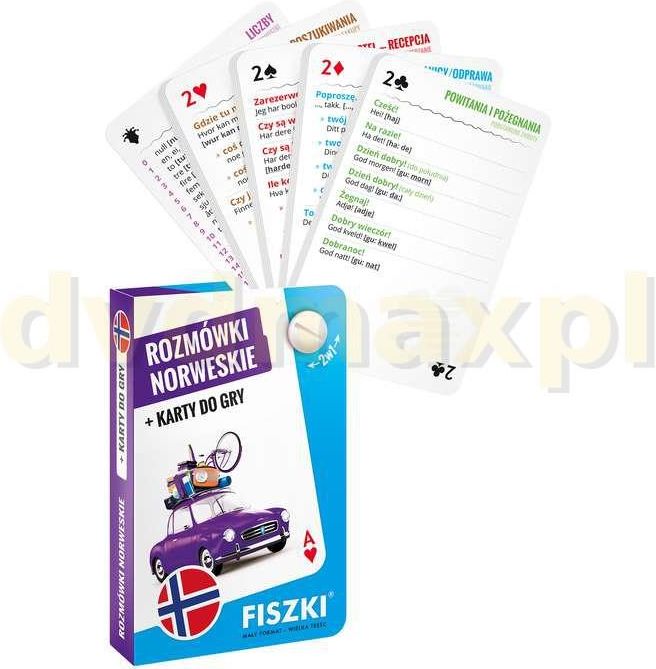 ROZMÓWKI norweskie i karty do gry 2w1 (A1-A2) Prezentowany tytuł zawiera ponad 300 najpotrzebniejszych zwrotów, które pozwolą Ci z łatwością porozumiewać się za granicą. Ale wystarczy odkręcić plastikową śrubkę, aby zamienić rozmówki… w karty do gry! Ten oryginalny format sprawia, że nasze rozmówki …