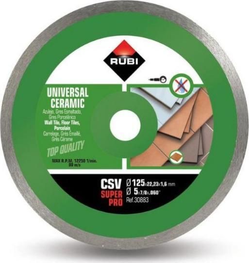 Tarcze diamentowe RUBI CSV z obrzeżem ciągłym są najlepszym wyborem do cięcia na sucho, przy użyciu szlifierki wszelkiego rodzaju płytek ceramicznych. Tarcze diamentowe CSV nadają się najlepiej do obróbki wszelkiego rodzaju materiałów ceramicznych. Tarcze CSV, jako model uniwersalny skraca czas potrzebny na zmianę tarczy przy zmianie materiału do cięcia. Dzięki temu, uzyskuje się dobrą jakość cięcia i optymalną wydajność w szerokim zakresie potencjalnych materiałów ceramicznych. Połączenie pomiędzy ziarnem diamentowym oraz stopem metalowym sprawia, że tarcze diamentowe CSV od RUBI idealnie nadają się do cięć płytek ceramicznych (glazurowanych oraz gresowych). Tarcza RUBI CSV jest tarczą z obrzeżem ciągłym. Ten rodzaj obrzeża diamentowego pozwala wykonawcy na uzyskanie wysokiej jakości wykończenia krawędzi cięcia. Kształt tarczy diamentowej RUBI CSV powoduje, że idealnie nadaje się do cięcia wszelkiego rodzaju materiałów ceramicznych i innych płytek kamiennych ściennych o grubości mniejszej niż 25 mm. Dzięki technice spawania laserowego udało się uzyskać połączenie pomiędzy obrzeżem diamentowym oraz metalowym dyskiem tarczy ciągłej RUBI CSV gwarantujące jakość cięcia i bezpieczeństwo użytkownika. Tarcze diamentowe RUBI oferowane są w dwóch klasach jakości: PRO oraz SUPERPRO. Tarcze jakości PRO zapewniają użytkownikom najlepszy stosunek jakości do ceny. Tarcze jakości SUPERPRO stanowią najlepszy wybór podczas najbardziej wymagających prac. Tarcze o grubości dysku mniejszej niż 2 mm nie są zalecane do cięć ukośnych na szlifierce.