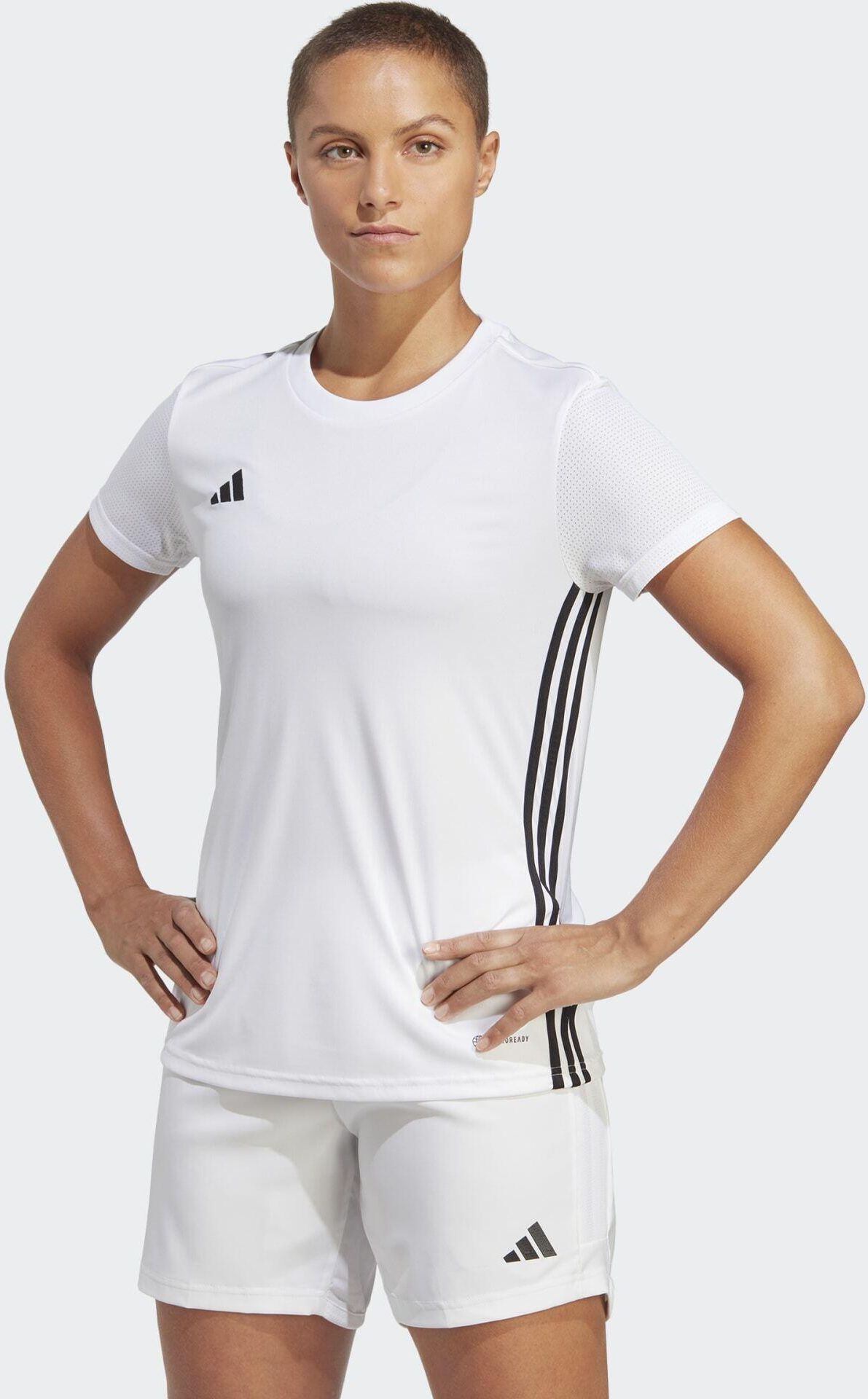 Koszulka damska adidas to jeden z najważniejszych elementów garderoby podczas treningów i decydujących rozgrywek, który pomoże zadbać o długotrwały komfort. Inspiracją do powstawia modelu był slogan „Keep it simple!”, który używany jest w piłce nożnej nie bez powodu. Niejednokrotnie jest on kluczem do spektakularnego sukcesu. Regularny krój z zaokrąglonym dekoltem o delikatnej, ściągaczowej strukturze naturalnie układa się na sylwetce zapewniając nieograniczony zakres ruchów, co w szczególności docenisz w trakcie intensywnych ćwiczeń. Koszulkę wyprodukowano z szybkoschnących włókien wspartych technologią Aeroready odpowiadającą za odprowadzenie nadmiaru wilgoci do zewnętrznych warstw w celu pozostawienia długotrwałego uczucia świeżości. Siateczkowe rękawy ułatwiają dostęp powierza, aby usprawnić proces wentylacji skóry. Poliestrowe włókna powstały w procesie recyklingu, dlatego aktywnie wspierasz walkę z zanieczyszczeniem plastikiem. Kolorystyka będzie spójnym wykończeniem sportowej stylizacji, a wyszywane logo brandu na piersi oraz kultowe paski po bokach podnoszą unikalność całego konceptu. Z dumą prezentuj swoją wolę walki wychodząc na boisko piłkarskie w koszulce adidas. Materiał: 100% poliester z recyklingu