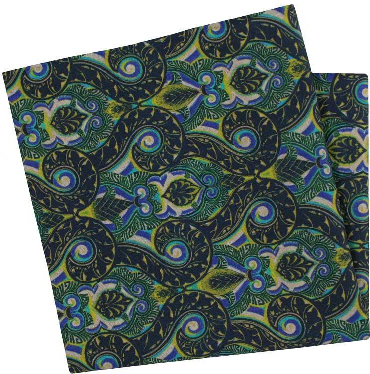 Prezentowana bawełniana poszetka ręcznie uszyta z motywem „pawiego oczka” w kolorystyce niebieski-granatowo-zielonej. Dobrze prezentuje się w połączeniu z krawatem, muszką, bądź samą marynarką. Wykonana została w 100% ręcznie, obszyta w rulonik. Odświeży i ożywi każdą stylizację. Dzięki połączeniu włoskiej bawełny i elastanu jest ona mięsista oraz dobrze współpracuje przy układaniu. Wymiary: 31cmx31cm Materiał: 97% bawełna, 3% elastan