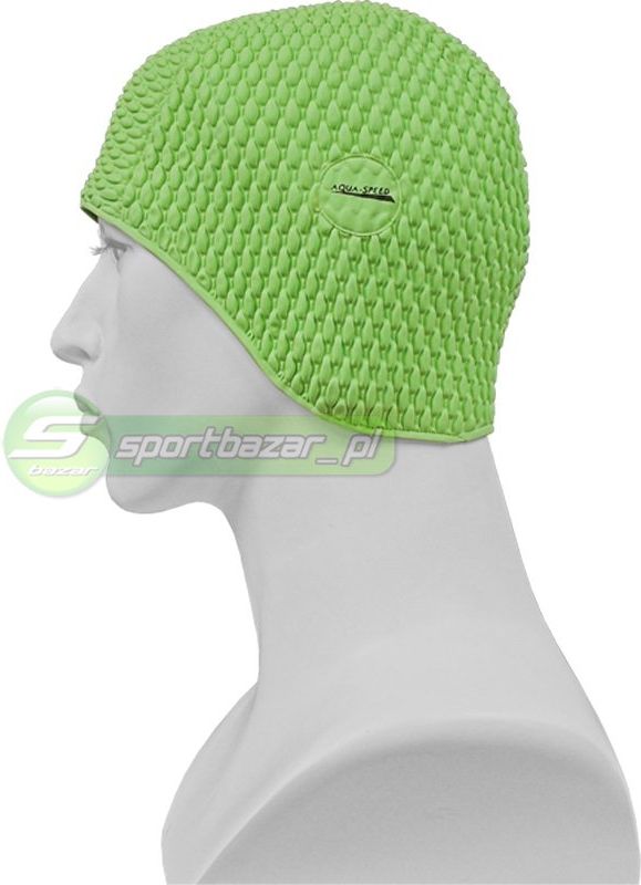 AQUA SPEED BOMBASTIC lateksowy czepek na długie włosy na basen numer katalogowy: 104-11 kolor: 11 zielony Czepek pływacki BOMBASTIC jest idealnym wyborem przede wszystkim dla kobiet z długimi włosami, którym zależy na przestronności czepka i wygodzie dopasowania. Wykonany z lateksu czepek BOMBASTIC jest również doskonałą propozycją dla pływaczek świadomych swojego stylu. Gruby gumowy materiał, z którego wykonany jest czepek oraz wypełnione powietrzem pęcherzyki na jego powierzchni sprawiają, że czepek ten lepiej chroni przed wychładzaniem niż standardowy, co oznacza, że jest szczególnie dobrym wyborem dla osób pływających na wodach otwartych i w odkrytych basenach. Najważniejsze cechy: wykonany z lateksu wyjątkowa stylistyka gruby materiał i podłużne pęcherzyki wypełnione powietrzem na całej powierzchni sprawiają, że czepek ma lepszą izolację termiczną niż standardowy czepek przystosowany dla osób z długimi włosami łatwy do zakładania i zdejmowania Wymiary: szerokość 26,5cm, wysokość 23cm