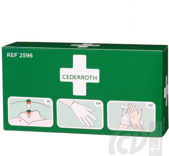 Zestaw ochronny CEDERROTH 2596 jest produktem ułatwiającym oddychanie usta-usta we właściwy sposób, a jednocześnie pozwalającym na zmniejszenie zagrożenia wynikającego z bezpośredniego kontaktu z poszkodowanym. CECHY PRODUKTU Maska do oddychania zaopatrzona jest w zaworek zwrotny. Na produkcie wydrukowany jest wyraźny opis metody oddychania usta-usta oraz sposób zakładania maski na twarzy poszkodowanego. Zaworek wskazuje, która strona skierowana ma być w stronę ratującego (zielona), a która poszkodowanego (czerwona). Wielkość maski sprawia, że ratujący nie wchodzi w kontakt z krwią lub wymiocinami zranionego. Zawartość zestawu: 1 szt. - maska do oddychania z zaworkiem zwrotnym, 4 pary rękawic jednorazowych, 2 szt. - chusteczki dezynfekujące.