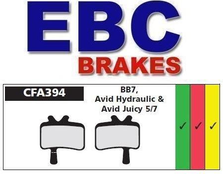 Klocki hamulcowe rowerowe EBC CFA394HH AVID JUICY, BB7 Klocki hamulcowe rowerowe CFA394HH złote (cross country, downhill) - klocki spiekane, oferują maksymalną efektywność w połączeniu z dużą żywotnością, wyznaczają nowy standard wśród klocków hamulcowych. Doskonałe do jazdy w trudnych warunkach (błoto, woda, piasek) oraz na długie strome zjazdy (najwyższa odporność na wysokie temperatury). Jeżeli masz problem z klockami standardowymi, wybierz złote - problem zniknie. Klocki te oferują potężną moc hamowania i najdłuższą żywotność. Oferowane również do downhillu do systemów oryginalnie wyposażonych w klocki spiekane i najwyższej jakości tarcze hamulcowe (nieoznaczone Resin Pad Only), aby uniknąć przegrzania systemu. Model przeznaczony do układów hamulcowych: AVID JUICY, BB7