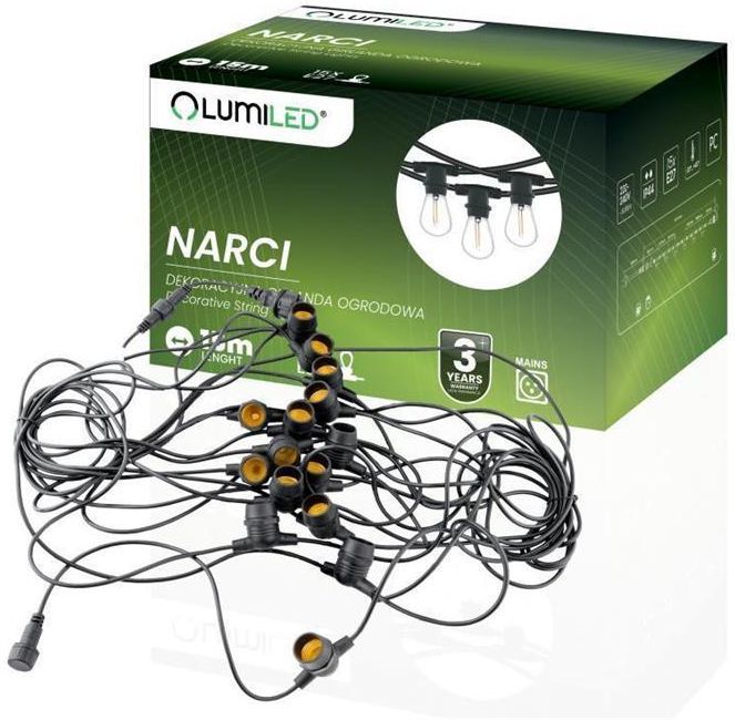 Girlanda Ogrodowa Zewnętrzna Łańcuch Świetlny 15m 15x E27 NARCI LUMILED Główne cechy produktu Girlanda, łańcuch świetlny o długości 15 metrów 15 punktów świetlnych w odległości co 100 cm Girlanda przystosowana do niekorzystnych warunków atmosferycznych - IP44 (deszcz, śnieg, grad), doskonale nadaje …