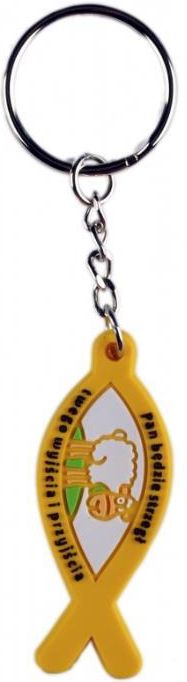 Breloczek gumowy rybka, wykonany z grubego tworzywa PVC, z metalowym kółkiem.
