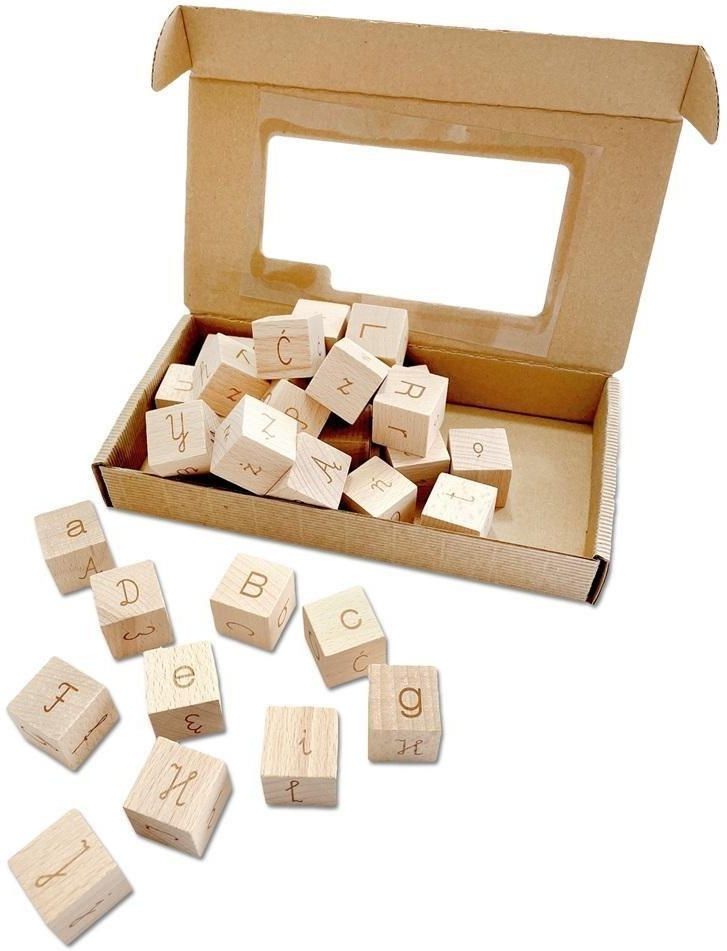 Prezentujemy klocki z alfabetem. Mają formę 32 kostek o wymiarach 25 x 25 x 25mm. Na klockach umieszczono alfabet pisany z małymi i dużymi literami oraz alfabet drukowany z małymi i dużymi literami. Elementy wykonano z naturalnego drewna. Zestaw zapakowany jest w kartonowe pudełko, w którym można …