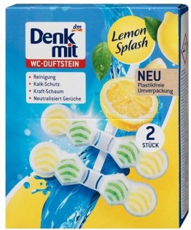 Denkmit Zawieszka do WC Lemon Splash 2 szt Zawieszka zapachowa do toalet Lemon Splash od Denkmit to doskonałe rozwiązanie, które zapewnia intensywne pieniące się czyszczenie oraz długotrwały świeży zapach. Nasza zawieszka neutralizuje nieprzyjemne zapachy, pozostawiając w toalecie przyjemną atmosferę. Dzięki połączeniu aktywnych składników, zapobiega także osadzaniu się osadu z moczu i kamienia, gwarantując higieniczną czystość przy każdym spłukaniu. Zapewnij przyjemną i odświeżającą atmosferę w toalecie dzięki Zawieszce do WC Lemon Splash. Nasz unikalny zapach cytrynowy sprawia, że wizyta w toalecie staje się jeszcze bardziej przyjemna. Odpręż się i ciesz się czystością oraz świeżym zapachem, który długo utrzymuje się w powietrzu. Nasza zawieszka nie tylko zapewnia przyjemny zapach, ale także intensywne pieniące się czyszczenie. Dzięki temu trudno dostępne miejsca w toalecie są dokładnie oczyszczone, a wszelkie zabrudzenia są skutecznie usuwane. To oznacza, że Twoja toaleta jest higienicznie czysta, nawet w miejscach trudno dostępnych. Dodatkowo, nasza zawieszka Lemon Splash zapobiega osadzaniu się osadu z moczu i kamienia. Dzięki specjalnym składnikom, utrzymuje czystość i świeżość nawet przy każdym spłukaniu, co jest kluczowe dla utrzymania higieny w toalecie. Ochrona przed osadzaniem się kamienia Power Foam Neutralizuje nieprzyjemne zapachy