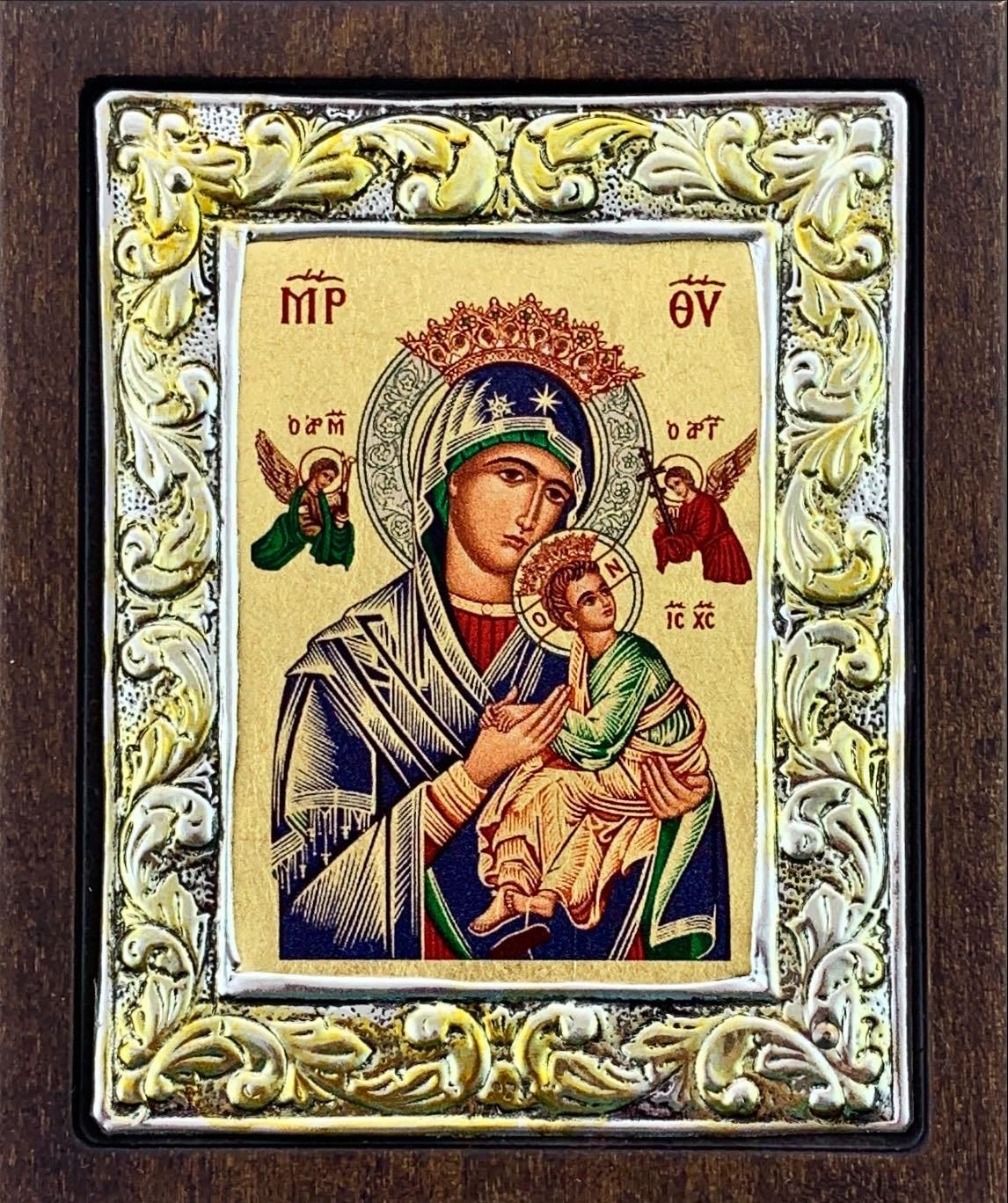 Ikona grecka na desce, w etui Rękodzieło prosto z Grecji. Koszulka metalowa została posrebrzona srebrem próby 925. Ikona posiada stosowny certyfikat. Wymiary ikony: 8 x 10 cm Doskonały pomysł na prezent!