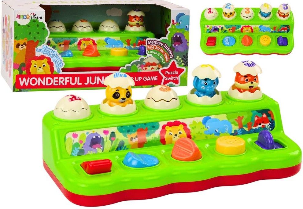 Zabawka Pop Up Wyskakujące Zwierzątka Panel Edukacyjny Dla Dzieci Dźwięki Ta kolorowa i interaktywna gra Pop Up to wspaniała zabawka, która zachwyci każde dziecko. Zabawka składa się z pięciu ponumerowanych jajeczek, z unikalnymi wzorami na każdym z nich. Pod każdym jajeczkiem znajduje się przycisk, który po naciśnięciu, przesunięciu lub przekręceniu sprawia, że z jajka wyskakuje jedno z pięciu uroczych zwierzątek: hipopotam, miś panda, lew, słoń i lisek. Każdy przycisk jest w innym kolorze, co pomaga w nauce rozpoznawania kolorów. Przyciski należy przesunąć, przeciągnąć lub przekręcić. Ta interaktywna zabawa nie tylko stymuluje zmysły, ale również rozwija umiejętności poznawcze poprzez zachęcanie do spostrzegawczości i koncentracji. Po zakończeniu jednej rundy zabawy, wystarczy zamknąć klapki z zwierzakami, aby rozpocząć nową sesję odkrywania. Ta funkcja zapewnia stałą rozrywkę i zachęca dzieci do powtarzania działań oraz uczenia się poprzez powtarzanie. Panel w swojej podstawie ma schowaną, rozkładaną rączkę transportową, dzięki czemu dziecko będzie mogło bez problemu transportować zabawkę. Dodatkowo zabawka wyposażona jest w dźwięki, które dodają jeszcze więcej radości do zabawy. Na obudowie znajdują się dwa przyciski regulujące poziom dźwięków: stopień pierwszy i drugi, oraz włącznik. Panel dźwiękowy oferuje różnorodne dźwięki, wesołą muzykę dla dzieci oraz odgłosy zwierzątek, co stymuluje rozwój zmysłów dziecka. Cała zabawka jest bardzo kolorowa, co przyciąga uwagę i zachęca do interakcji. To idealny sposób na rozwijanie umiejętności motorycznych, rozpoznawania kształtów i kolorów, a także naukę koordynacji ręka-oko, dostarczając przy tym mnóstwo radości i zabawy. Wymiary panelu 32 cm x 16 cm x 10 cm Wymiary opakowania 38 cm x 16 cm x 17 cm Zabawka zasilana jest trzema bateriami 1.5V AA, które nie są elementem zestawu. Posiada certyfikat CE, ponadto jest zgodny z normą EN71. Przeznaczony dla dzieci powyżej 12 miesiąca życia. Informacje o produkcie Długość towaru w centymetrach 38 Ostrzeżenie! Nieodpowiednie dla dzieci w wieku poniżej 3 lat Płeć Chłopcy, Dziewczynki Wiek +3 Wysokość towaru w centymetrach 17 Szerokość towaru w centymetrach 16 Waga gabarytowa w gramach 1722.67