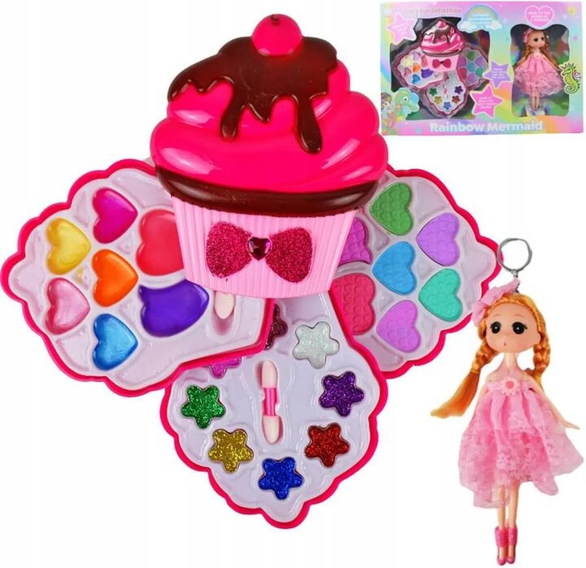 Magiczny zestaw kosmetyków Rainbow Mermaid z uroczą lalką to doskonały prezent dla małych miłośniczek makijażu i zabawy w syrenki. Kolorowy zestaw w kształcie babeczki zawiera wszystko, czego potrzeba do tworzenia pięknych stylizacji.Opis produktu:Zestaw Rainbow Mermaid to wyjątkowa zabawka edukacyjna, która rozwija kreatywność i wyobraźnię dziecka. Głównym elementem jest stylowa kosmetyczka w kształcie babeczki z różowym kremem i czekoladową polewą, która otwiera się jak kwiat, odsłaniając bogaty zestaw kolorowych kosmetyków. W środku znajdziemy paletę cieni do powiek w kształcie serduszek w różnych kolorach tęczy, brokatowe gwiazdki oraz aplikator do makijażu. Do zestawu dołączona jest piękna lalka syrenka w różowej sukience z długimi włosami, która może służyć jako model do stylizacji. Wszystkie kosmetyki są bezpieczne dla dzieci i łatwe do zmycia wodą. Zestaw wykonany jest z wysokiej jakości materiałów, które zapewniają długotrwałą zabawę.Najważniejsze cechy: Wiek – od 3 lat, idealny dla dzieci w wieku przedszkolnym Zestaw – kosmetyczka-babeczka z paletą cieni i lalka syrenka Bezpieczeństwo – kosmetyki bezpieczne dla dzieci, łatwe do zmycia Materiał – wysokiej jakości tworzywo sztuczne, trwałe i bezpieczne Korzyści edukacyjne – rozwija kreatywność, wyobraźnię i umiejętności manualne Zastosowanie – zabawa w domu, prezent urodzinowy, rozwijanie zainteresowań artystycznych