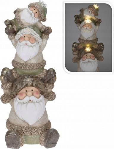 3 Mikołaje pięknie prezentują się przy kominku, na półce, na parapecie czy pod choinką. Ozdoba dodaje wnętrzu bożonarodzeniowego klimatu, jednocześnie czyniąc dom przytulnym i ciepłym. Parametry: Wysokość: 68 cm Szerokość: 24 cm Ozdoba LED Zasilanie: na baterie Baterie: 3 x AA (brak w zestawie) Barwa światła: ciepła biała Materiał wykonania: gips Motyw: Mikołaj Kolor dominujący: beżowy, brązowy, zielony, złoty Zastosowanie: świąteczna ozdoba wnętrza domu