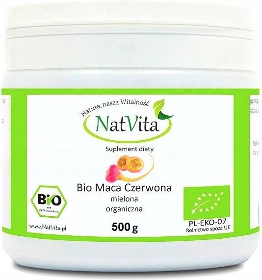 NatVita - Bio Maca Czerwona - Organiczna - 500g Organiczna maca, odmiana czerwona. BIO MACA CZERWONA RAW (Lepidium meyenii) Suplement diety. Maca jest roślinną dwuletnią rośliną z rodziny Crucifer naturalnie występujących w wysokich Andach Peru. Jej hiszpańskie i Quechua nazwy to maca-maca, maino, ayak chichira, ayak willku. Jest to roślina uprawiana w celu pozyskania swojej mięsistej bulwy. Maca jest używana zarówno jako warzywo jak i zioło lecznicze. Maca jest jedynym przedstawicielem swojego rodzaju z mięsistą bulwą, która jest połączona z korzeniem, tworząc szorstki odwrócony korpus o kształcie gruszki. Poszczególne odmiany różnią się między sobą wielkością i kształtem korzenia, który może być trójkątny, spłaszczony okrągły, sferyczny lub prostokątny. Bulwy Maca mogą być koloru złotego lub kremowego, czerwonego, fioletowego, niebieskiego, czarnego lub zielonego. Każdy z nich jest uważany za "genetycznie unikatową odmianę", ponieważ nasiona rodzicielskich roślin mają korzenie o tym samym kolorze. Składniki: 100% Bio maca czerwona (Lepidium meyenii) korzeń mielony. Bio - certyfikowane produkty ekologiczne. Sposób spożycia: 1 gram (2ml) (zgodnie z załączoną miarką) proszku wymieszać w szklance wody. Stosować 2 razy dziennie. Uwagi i zalecenia: suplementy diety nie mogą być stosowane jako substytut (zamiennik) zróżnicowanej diety. Zalecany jest zrównoważony sposób żywienia oraz zdrowy tryb życia. Produkt nie może być stosowany przez osoby uczulone na którykolwiek z jego składników. Przechowywanie: przechowywać w suchym i ciemnym miejscu, niedostępnym dla małych dzieci. Nat Sp. z o .o. Wrocławska 33D, Długołęka 55 095 Mirków Rolnictwo spoza UE Kraj pochodzenia: Peru Suplement Diety. Uwagi i zalecenia: suplementy diety nie mogą być stosowane jako substytut (zamiennik) zróżnicowanej diety. Tylko zdrowy tryb życia i zrównoważony sposób odżywiania zapewniają prawidłowe funkcjonowanie. Produkt nie może być stosowany przez osoby uczulone na którykolwiek z jego składników. Przechowywać w suchym i ciemnym miejscu, niedostępnym dla dzieci.